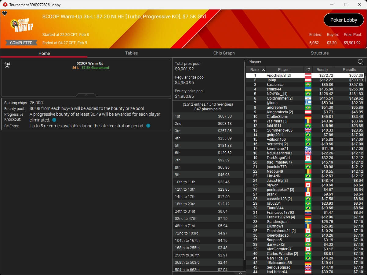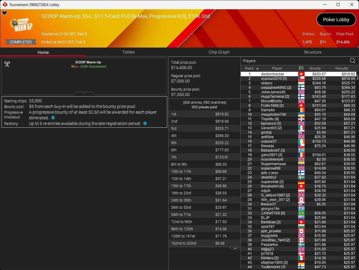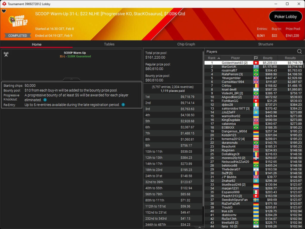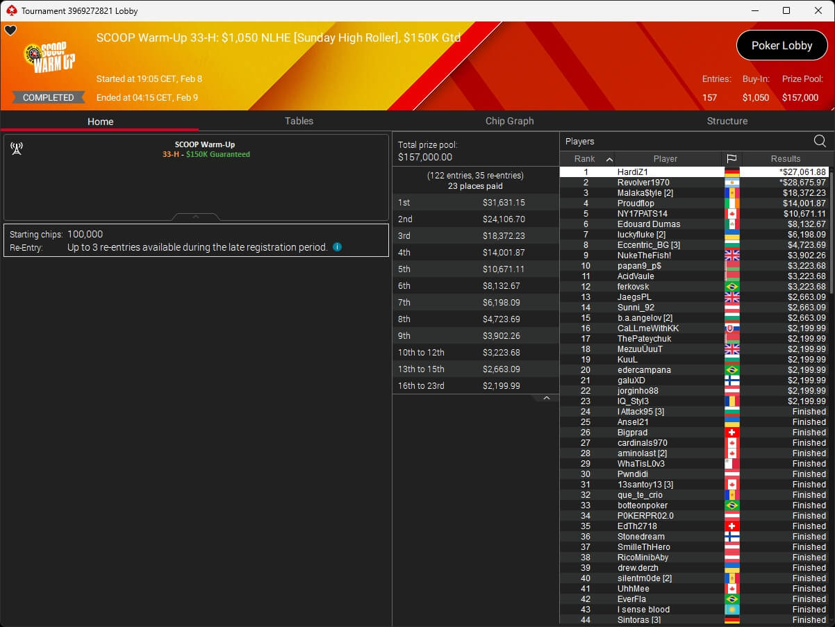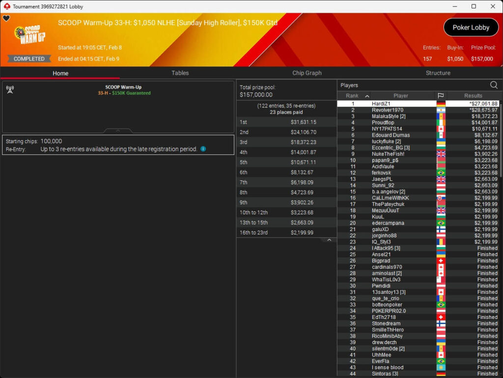 Ein weiterer erfolgreicher Sonntag für die deutschsprachige Poker-Community auf PokerStars. GoldenHawk83 ($9.718,79 + $5.209,03; $22 StacKOsaurus), HardiZ1 ($27.061,88; $1.050 Sunday High Roller), doctorchecker ($919,82 + $820,67; $11 5-Card PLO) und ApocheliuS ($607,30 + $272,72; $2,20 Turbo PKO) spielten beim SCOOP Warm-Up Titel ein.