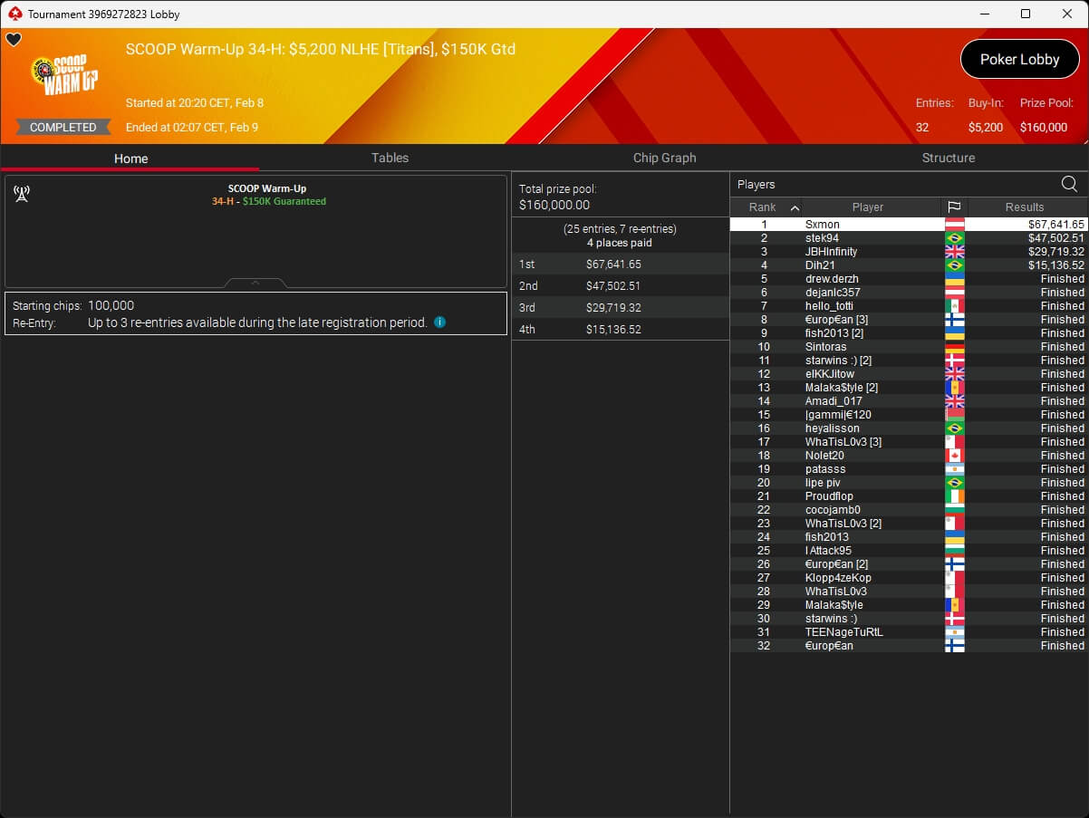 Sxmon hat auf PokerStars das $5.200 Titans Event gewonnen. Die DACH-Gemeinde hat bei der SCOOP Warm-Up Series insgesamt fünfmal Gold geholt.