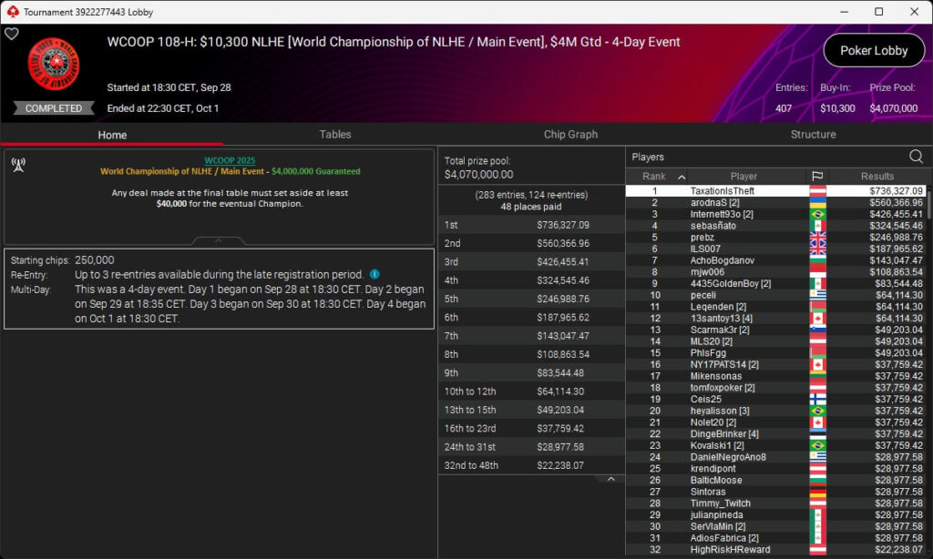 Der Niederländer TaxationIsTheft hat das $10k Main Event der PokerStars World Championship of Online Poker 2025 gewonnen.