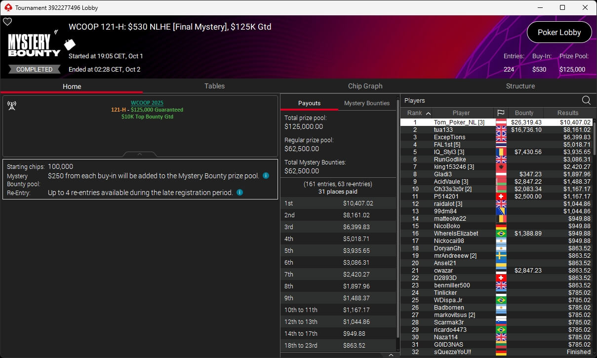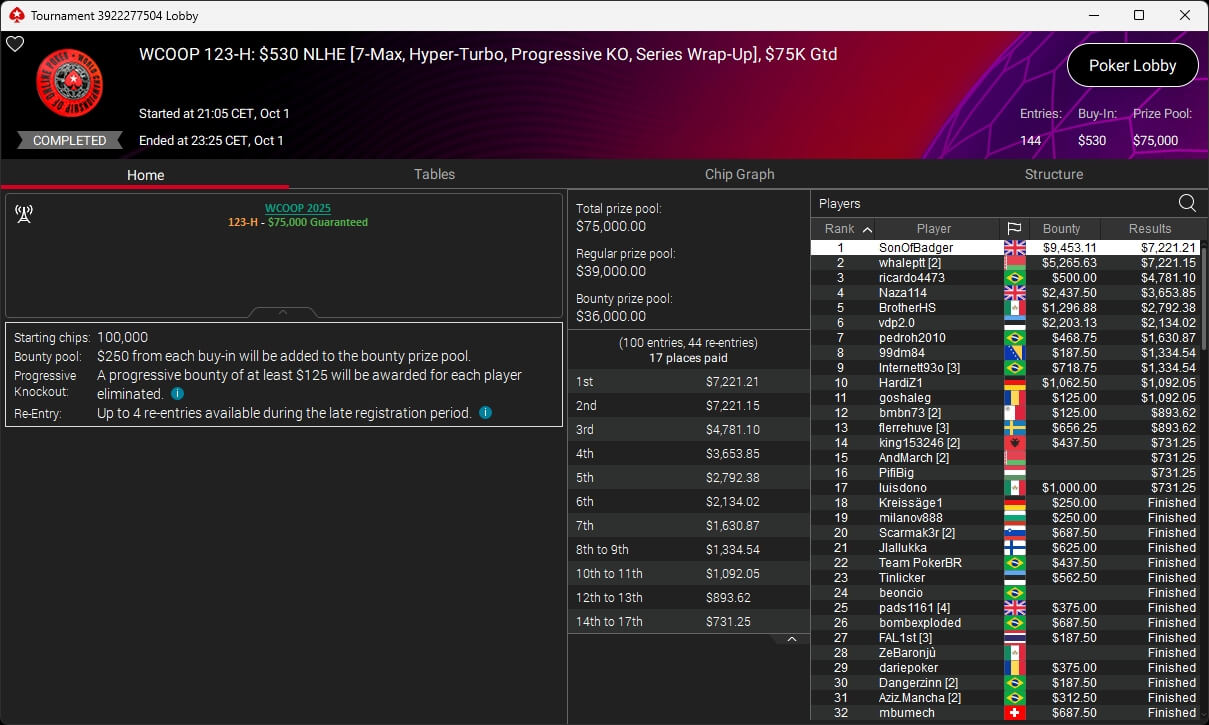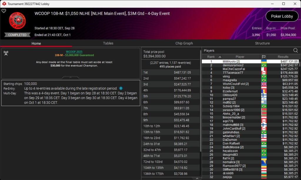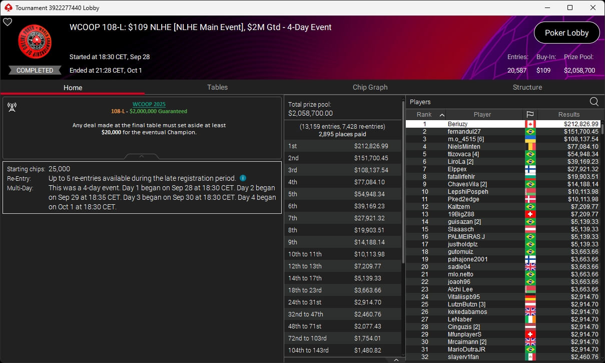 Die WCOOP 2025 auf PokerStars ist beendet. Zum Abschluss gab es einige Side Events sowie die Entscheidung bei den drei Main Event Turnieren. Im $109 Main Event setzte sich am Ende der Kanadier Rayan „beriuzy“ Chamas durch. Er bezwang im Heads-Up den Brasilianer fernandul27 ($151.700,45) und ging mit $212.826,99 vom Tisch. Rang 3 ging an den Ukrainer m.o_4515 ($108.137,54).