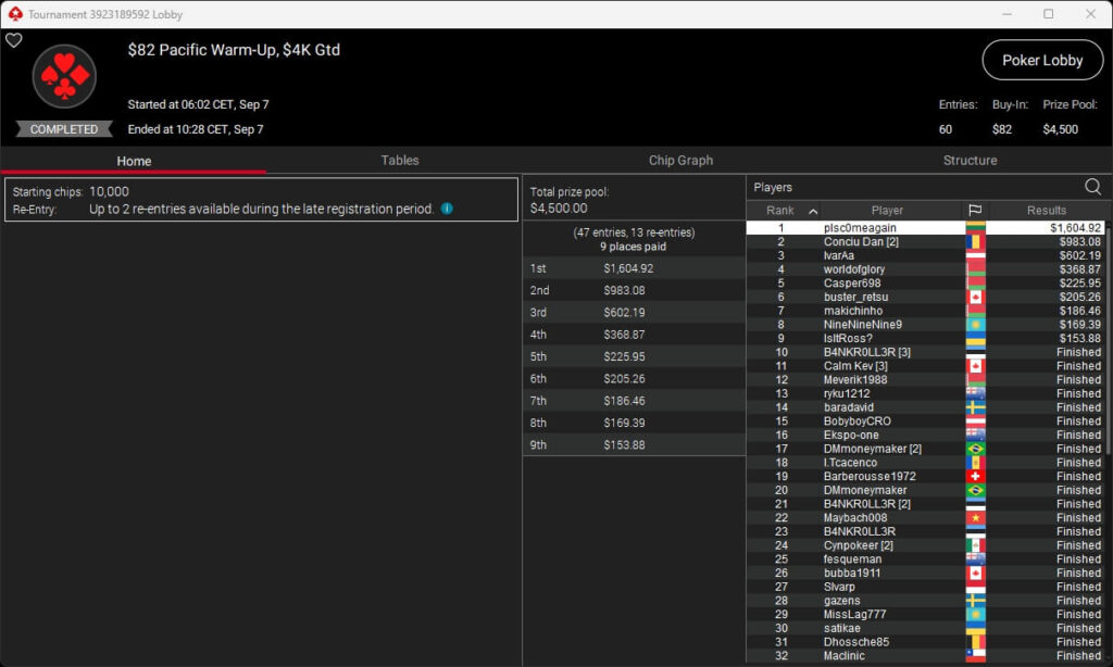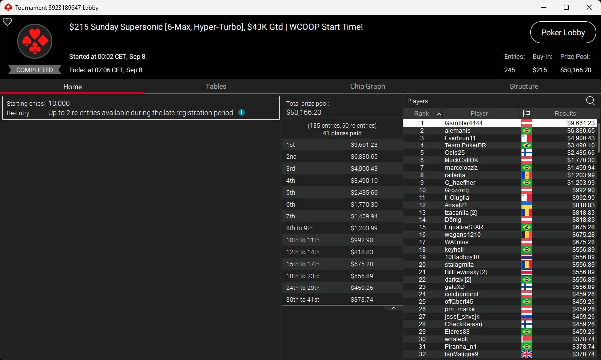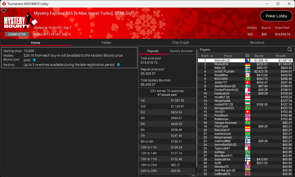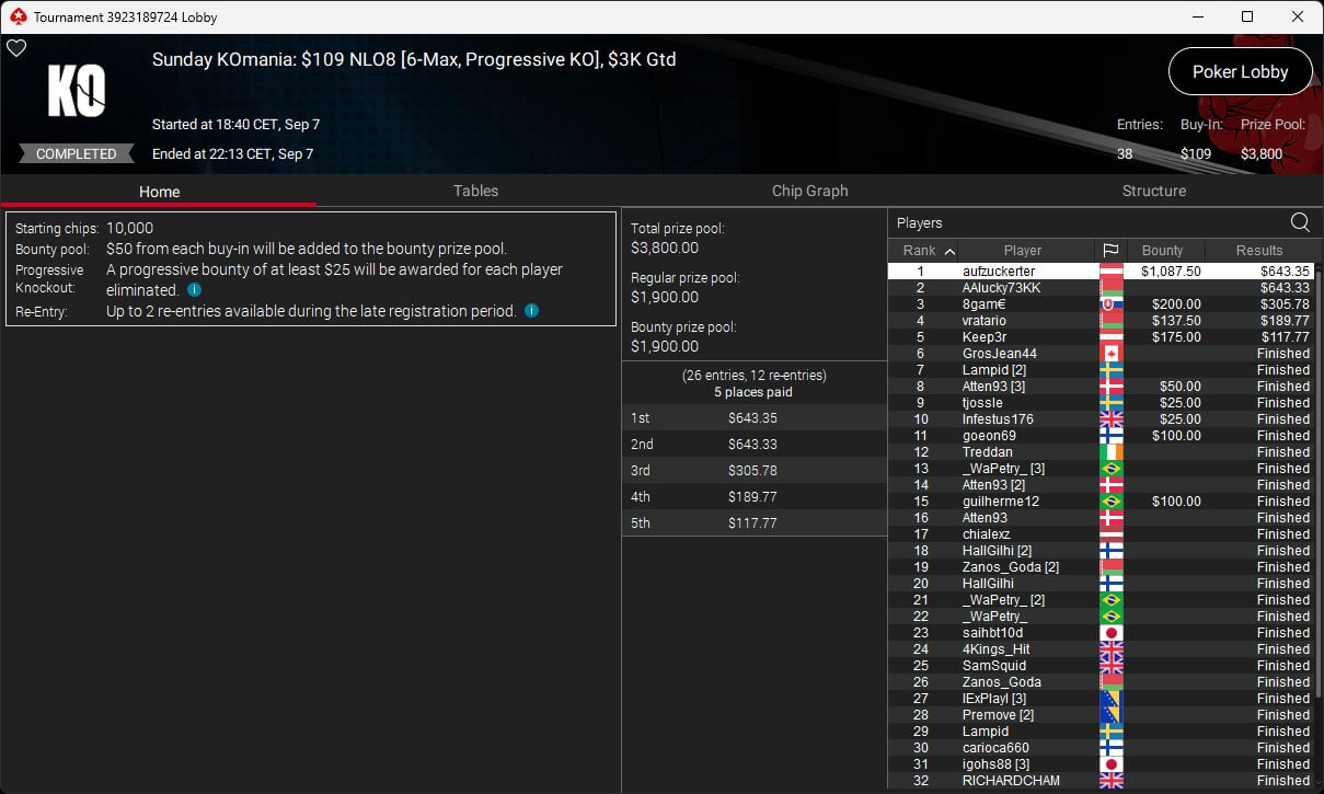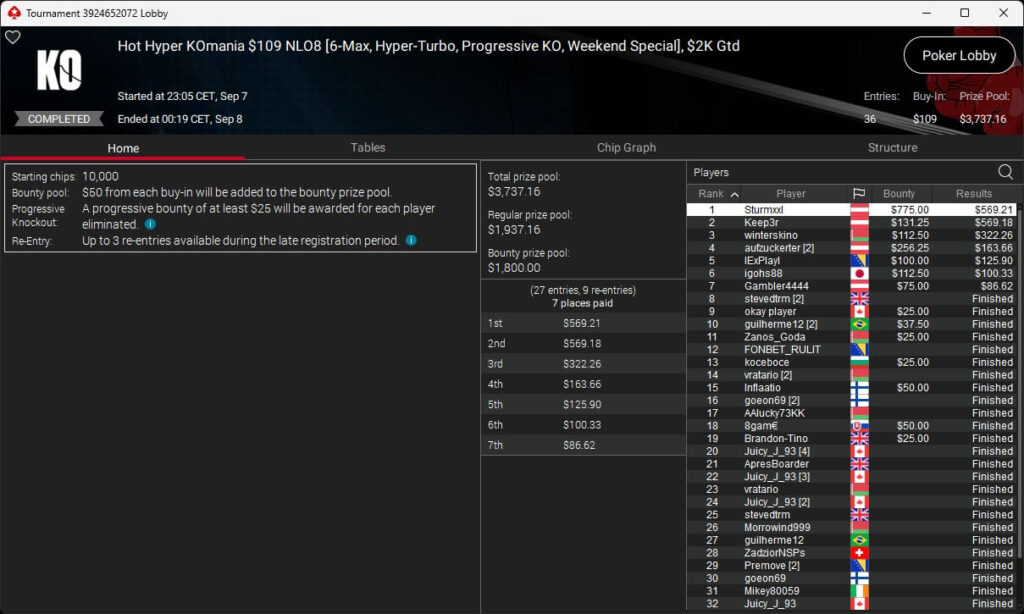 Bei den regulären MTTs verbuchten Christian „Gambler4444“ Nolte ($9.661,23; $215 Sunday Supersonic), 1djillip ($1.696,86; $55 Shuffle), aufzuckerter ($643,35 + $1.087,50; $109 NLO8 6-Max), TomNB ($2.111,37; $75 Spectral Shadow), Sturmxxl ($569,21 + $775; $109 NLO8 PKO) und !!f1ghtback! ($2.889,92; $109 Hotter Hyper) Turniersiege.