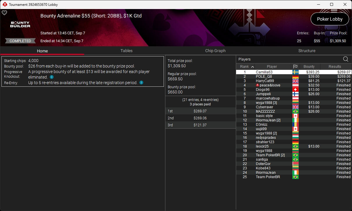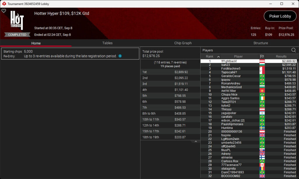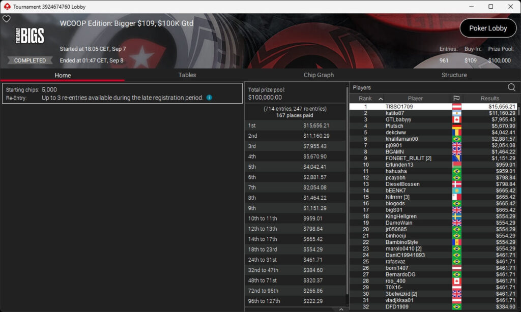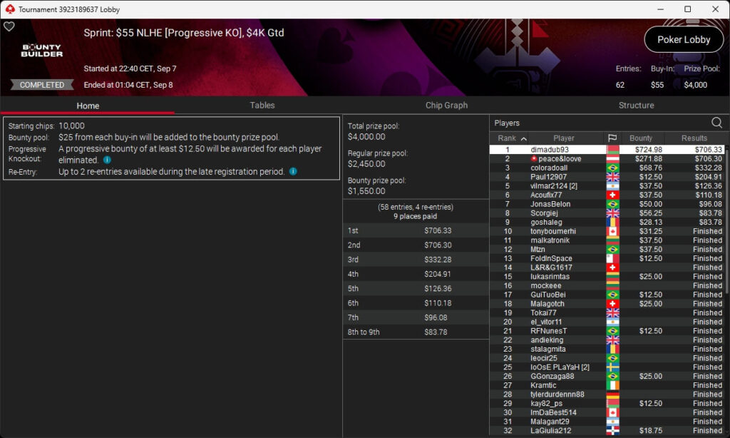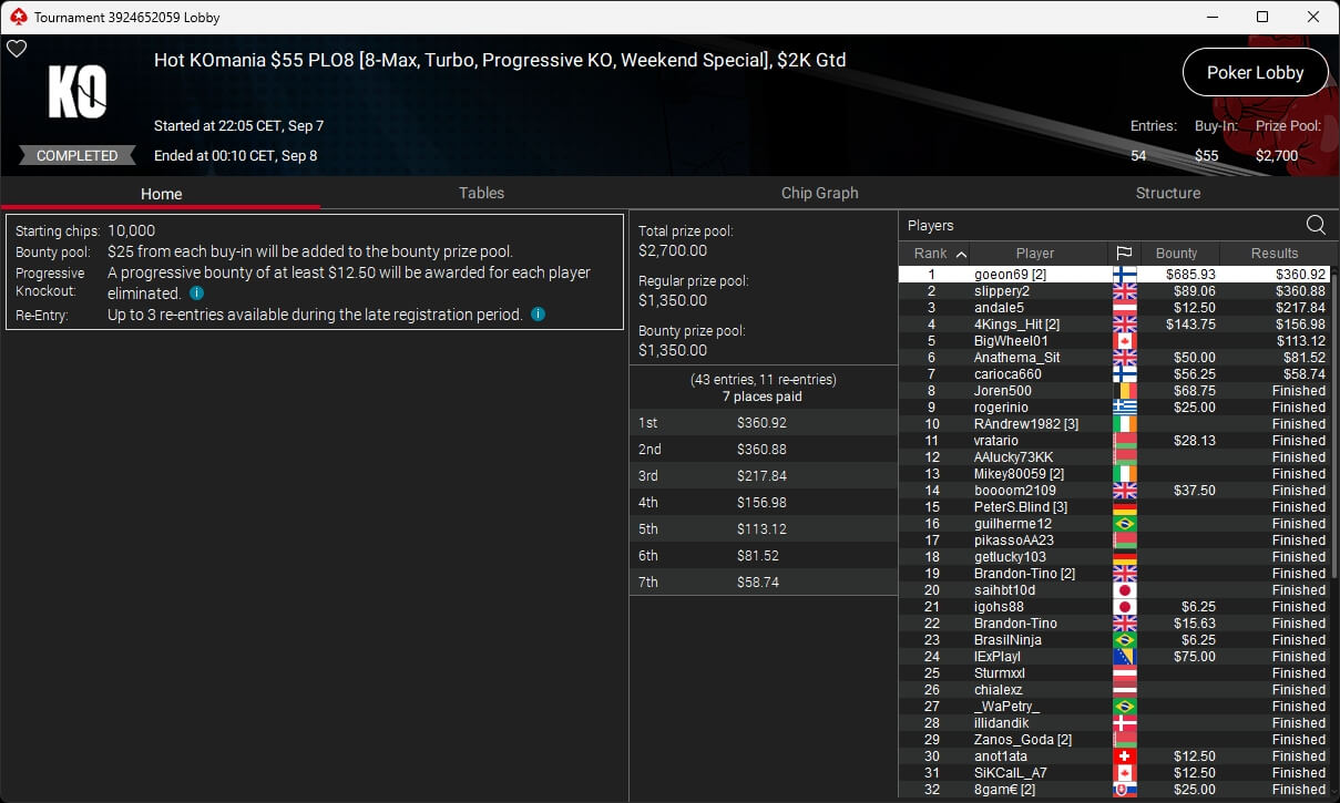 Bei den regulären MTTs verbuchten Christian „Gambler4444“ Nolte ($9.661,23; $215 Sunday Supersonic), 1djillip ($1.696,86; $55 Shuffle), aufzuckerter ($643,35 + $1.087,50; $109 NLO8 6-Max), TomNB ($2.111,37; $75 Spectral Shadow), Sturmxxl ($569,21 + $775; $109 NLO8 PKO) und !!f1ghtback! ($2.889,92; $109 Hotter Hyper) Turniersiege.