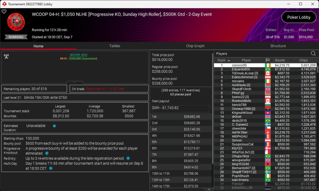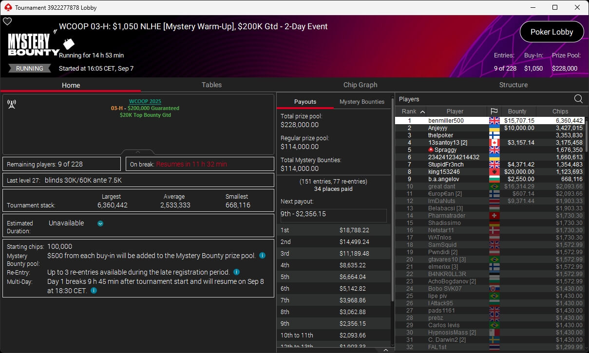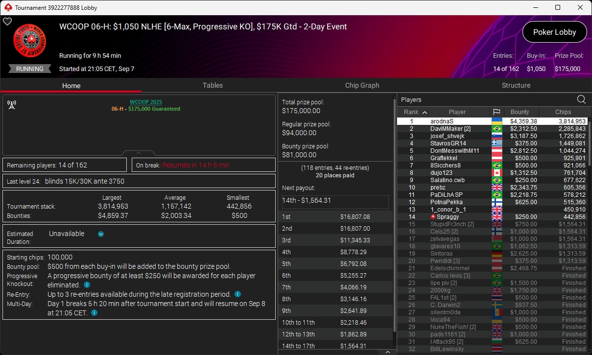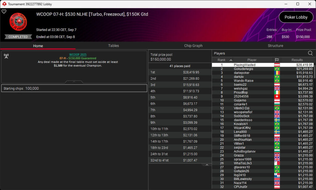 Gestern ist auf PokerStars die WCOOP 2025 gestartet. Direkt zum Auftakt sicherte sich David „PlayingWasted“ Kaufmann einen Titel. Der ehemalige WCOOP Main Event Champion siegte im $530 NLHE Turbo Freezeout ($28.419,95). TISSO1709 ($15.656,21; $109 Bigger) und Ac-King00 ($1.380,01 + $2.376,53; $55 NLO8) spielten ebenfalls Titel ein.