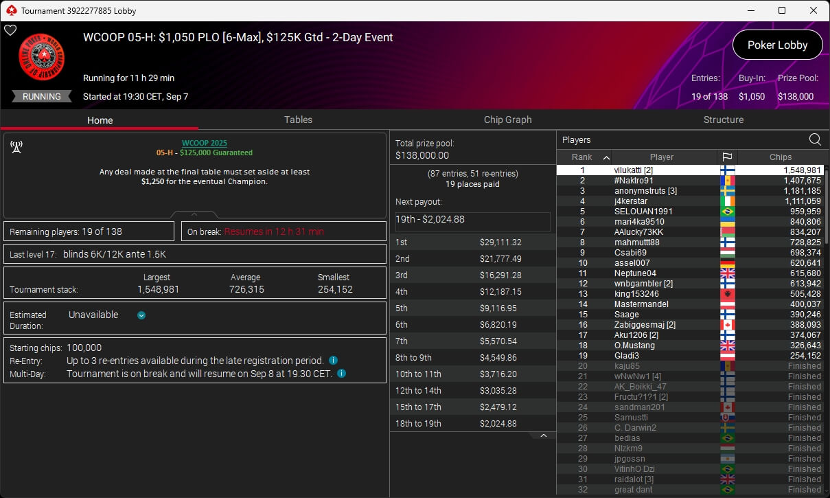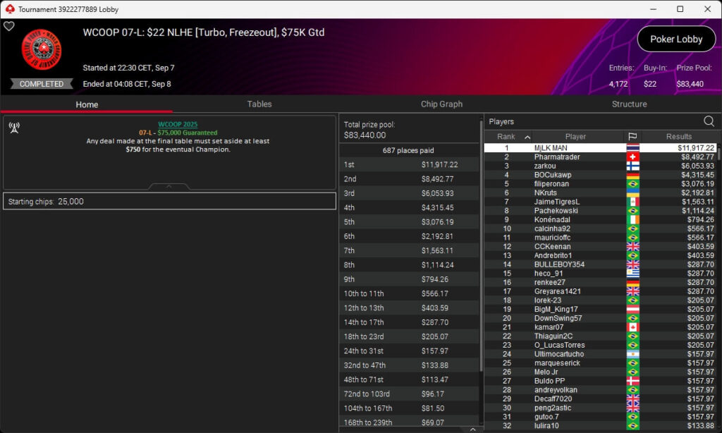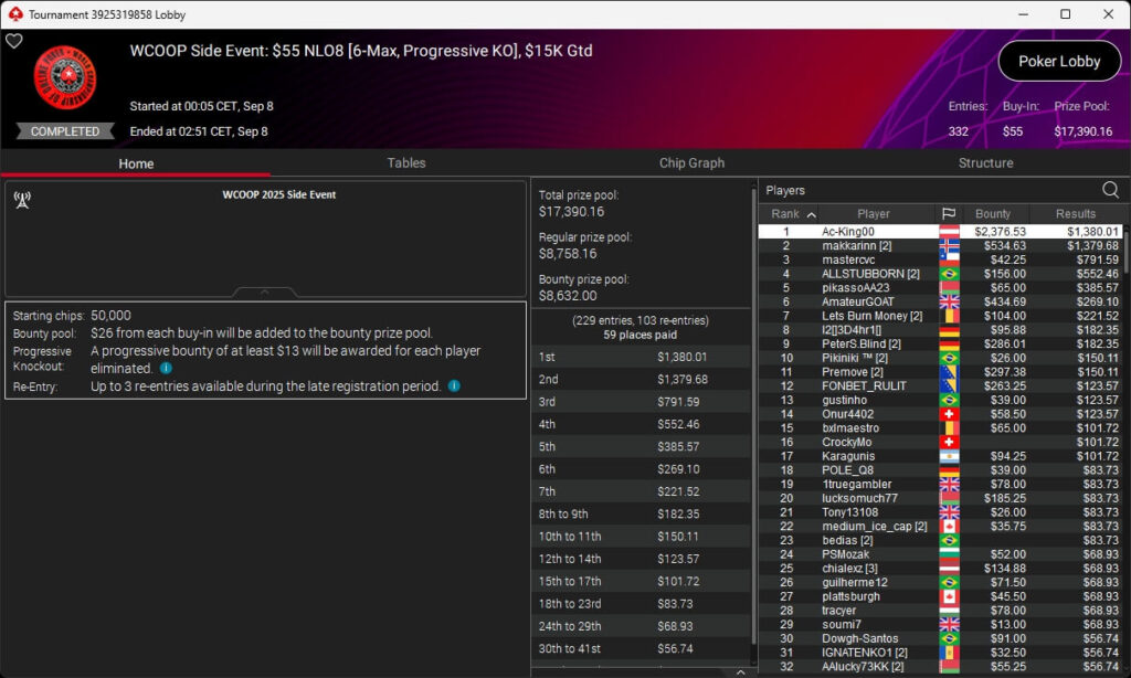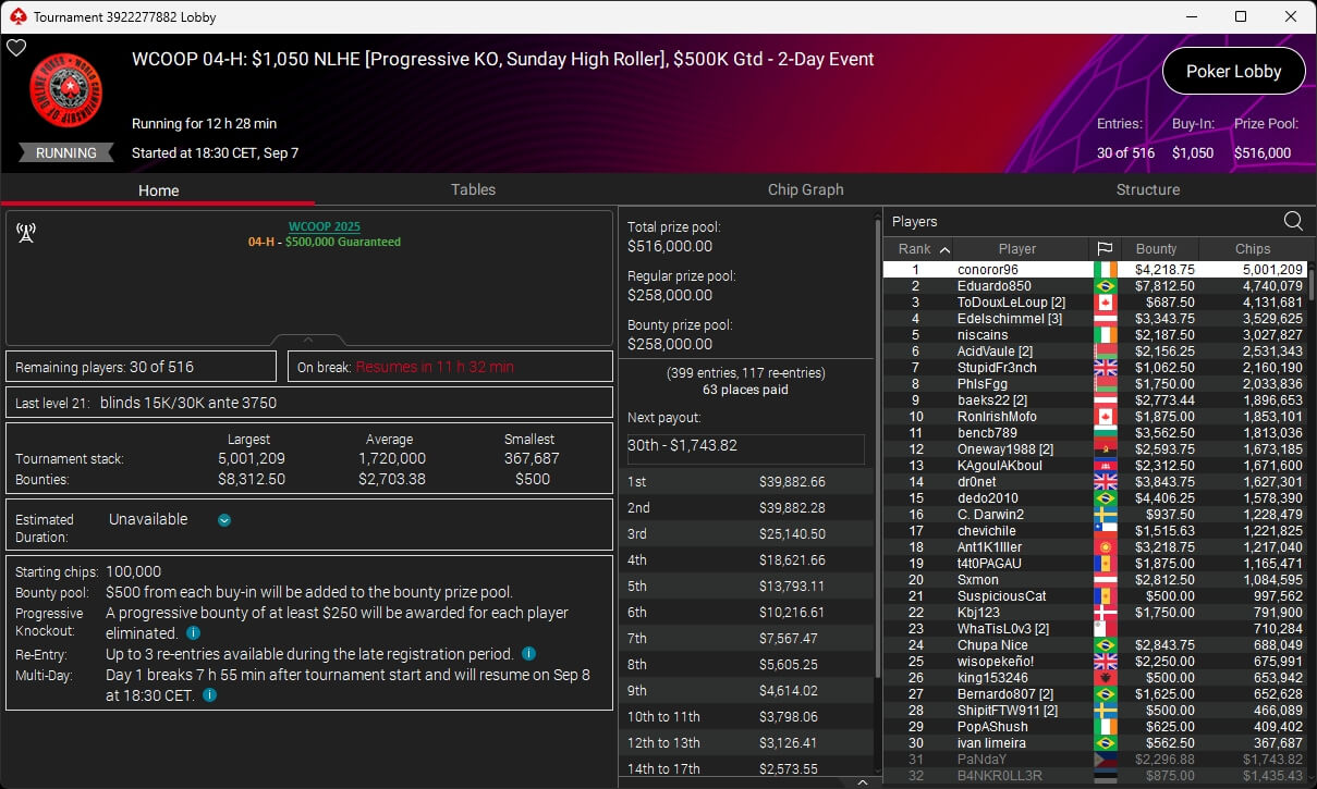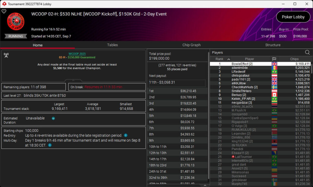 Gestern ist auf PokerStars die WCOOP 2025 gestartet. Direkt zum Auftakt sicherte sich David „PlayingWasted“ Kaufmann einen Titel. Der ehemalige WCOOP Main Event Champion siegte im $530 NLHE Turbo Freezeout ($28.419,95). TISSO1709 ($15.656,21; $109 Bigger) und Ac-King00 ($1.380,01 + $2.376,53; $55 NLO8) spielten ebenfalls Titel ein.