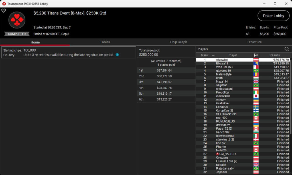 Beim $5.200 Titans Event reichten 41 Spieler und sieben Re-Entries nicht aus, um die $250.000 GTD zu knacken. Nach Heads-up-Deal setzte sich Ole Schemion ($76.676,79) gegen den Boisnier Ebaaa11 (2./$71.380,35) durch. Zu den weiteren Finalisten gehörten Enrico „WhaTisL0v3“ Camoscio (3./$41.198,67), Gabriel „gtavares10“ Tavares (4./$28.207,75) und Juan „Malaka$tyle“ Pardo Domínguez (5./$19.313,17).
