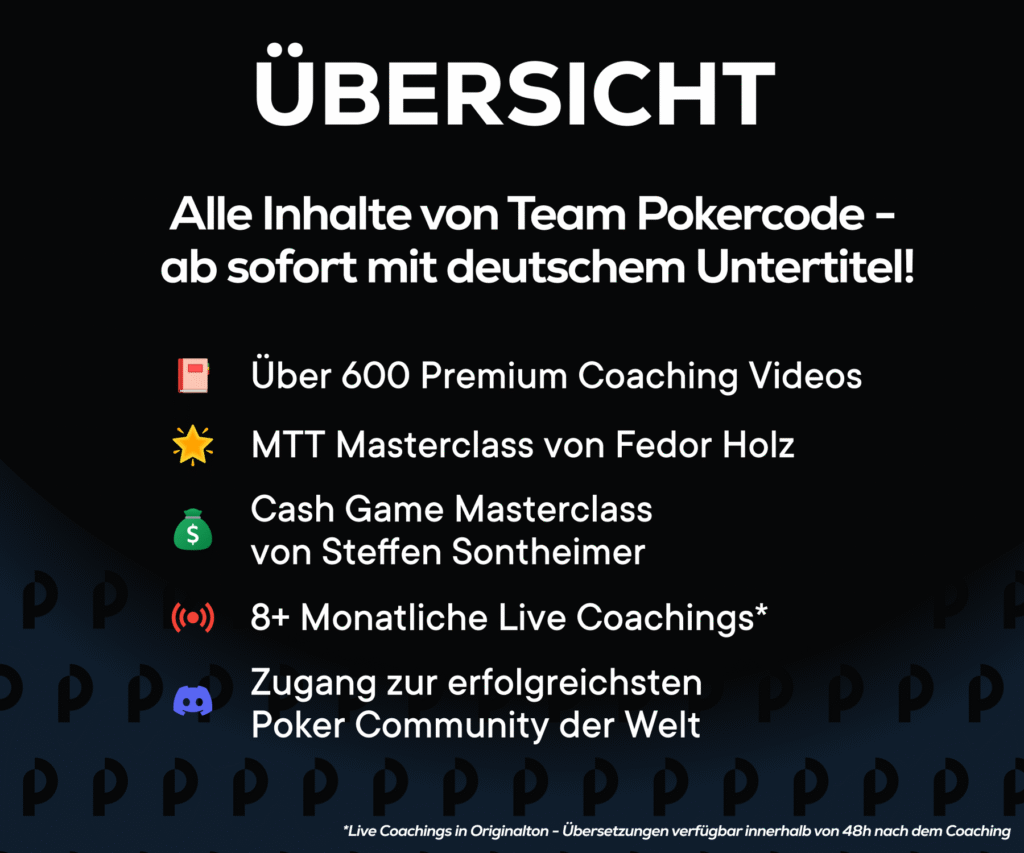 Ab sofort wird der Einstieg in die Pokercode Community für die deutschsprachigen Spieler deutlich leichter, denn endlich gibt es den kompletten Pokercode Content mit deutschen Untertiteln. Fedor Holz , Co-Founder und Head Coach von Team Pokercode: „Wir sind unglaublich stolz darauf, was wir mit Team Pokercode auf der internationalen Bühne aufgebaut haben. Unsere Mission ist klar: Wir wollen euch das perfekte Umfeld bieten, damit ihr euer volles Potenzial am Tisch ausschöpfen könnt. Wenn man sich die Entwicklung unserer aktuellen Mitglieder anschaut, sind wir damit auf einem sehr guten Weg. Mit den deutschen Untertiteln öffnen wir jetzt die Tür für alle, die sich bisher von der englischen Sprachhürde haben abschrecken lassen.”