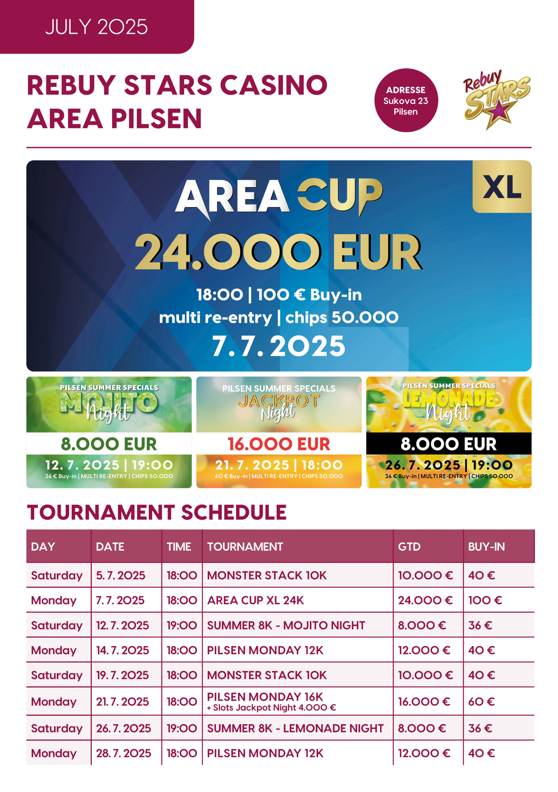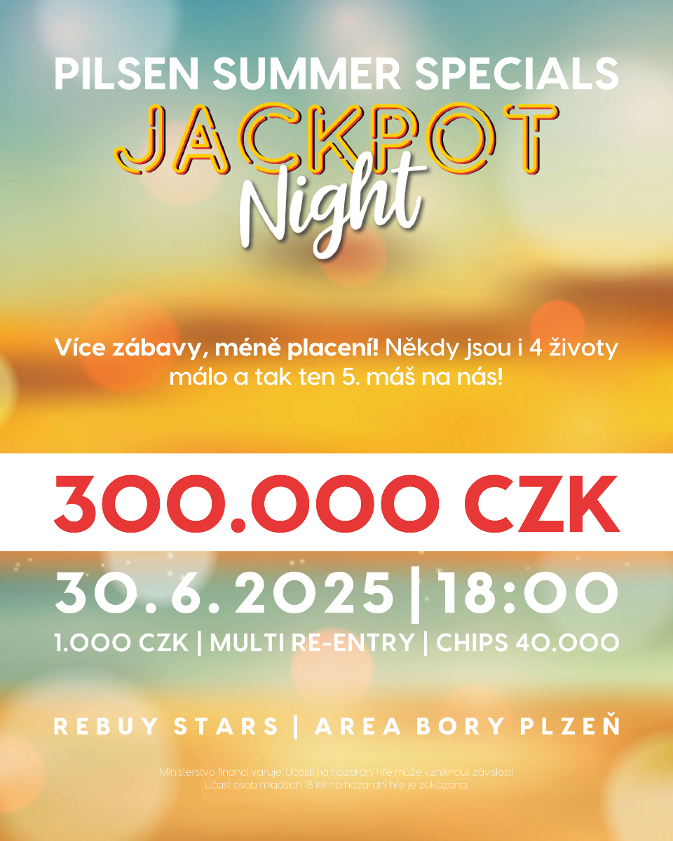 Immer montags und samstags gibt es im Rebuy Stars Casino Area Bory Pilsen (CZ) Turnieraction. Mt dem € 40 Jackpot Night (€ 12.000 GTD) lässt man heute den Juni ausklingen.