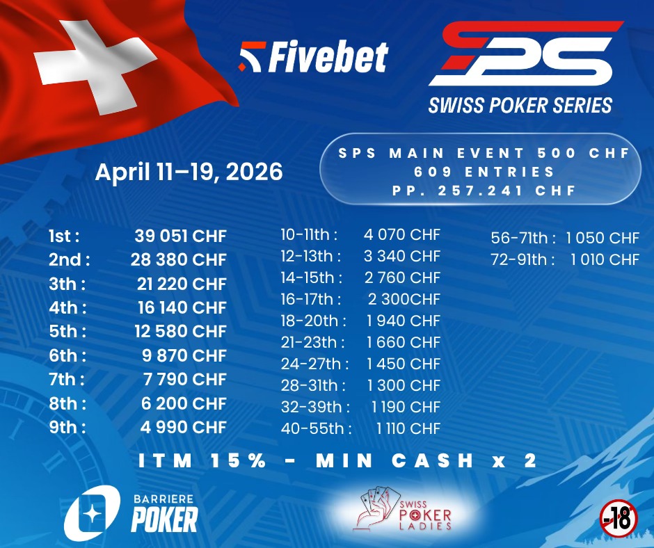 Montreux bleibt ein gutes Pflaster für die Swiss Poker Series. Gleich 609 Entries konnte man beim CHF 440 + 60 Main Event der SPS im Casino Barriere Montreux erreichen und damit einen Preispool von CHF 257.241. Mit 91 Spielern geht es heute in Tag 2, auf den Sieger warten morgen CHF 39.051.