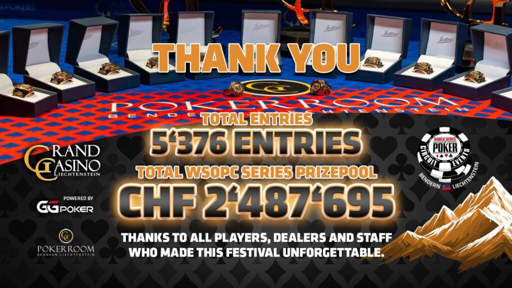 Übrigens – das Main Event 2024 hatte 566 Entries, der spanische Sieger Victor Gil den Houting konnte sich über € 55.000 freuen. Der Schweizer Mathias Jordi (4/€17.800) war ebenso am Final Table wie der Österreicher Mario Eder (6/€ 10.600). Dafür konnte der Deutsche „FriDiGiDi“ The Hendon Mob Championship bei 334 Entries für sich entscheiden und über € 14.600 Preisgeld jubeln.