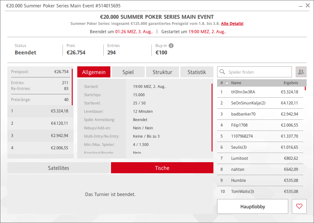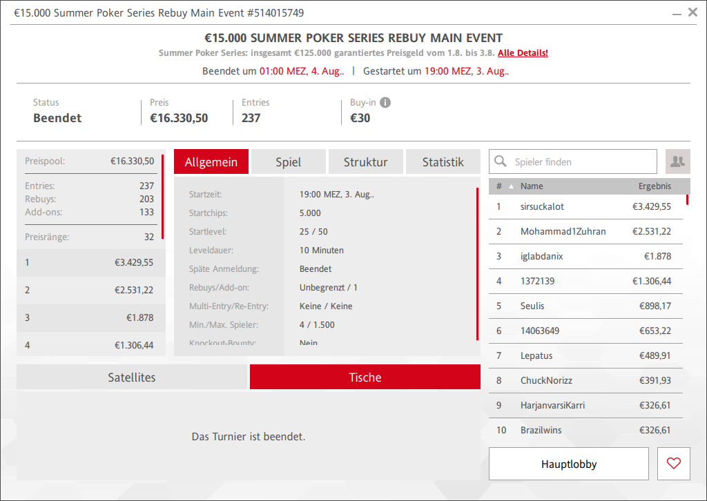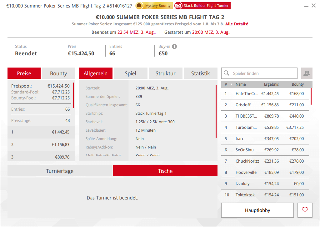 € 125.000 an Preisgeldern garantierte man am Wochenende, wobei die Preispools teils sehr viel größer waren.So waren es am Samstag beim € 100 Main Event gleich 294 Entries (211/83) und damit € 26.754 Preisgeld. Sieger tH3hn3w3RA kassierte € 5.324 Preisgeld. Auch beim € 30 Rebuy Main Event am gestrigen Sonntag konnte man mit 237 Startern, 203 Rebuys und noch 133 Add-On der Preispool auf € 16.330 geschraubt werden. sirsuchalot sicherte sich €3.429 für den Sieg. Die € 10.000 Preisgeldgarantie beim € 50 Flight Turnier wurde klar übertroffen, 339 Entries sorgten für € 15.424 im Pot. HateTheCrash holte den Sieg für € 1.442 + € 168. Pumpk1nhead holte den Sieg beim € 100 Super Sunday für € 4.070.