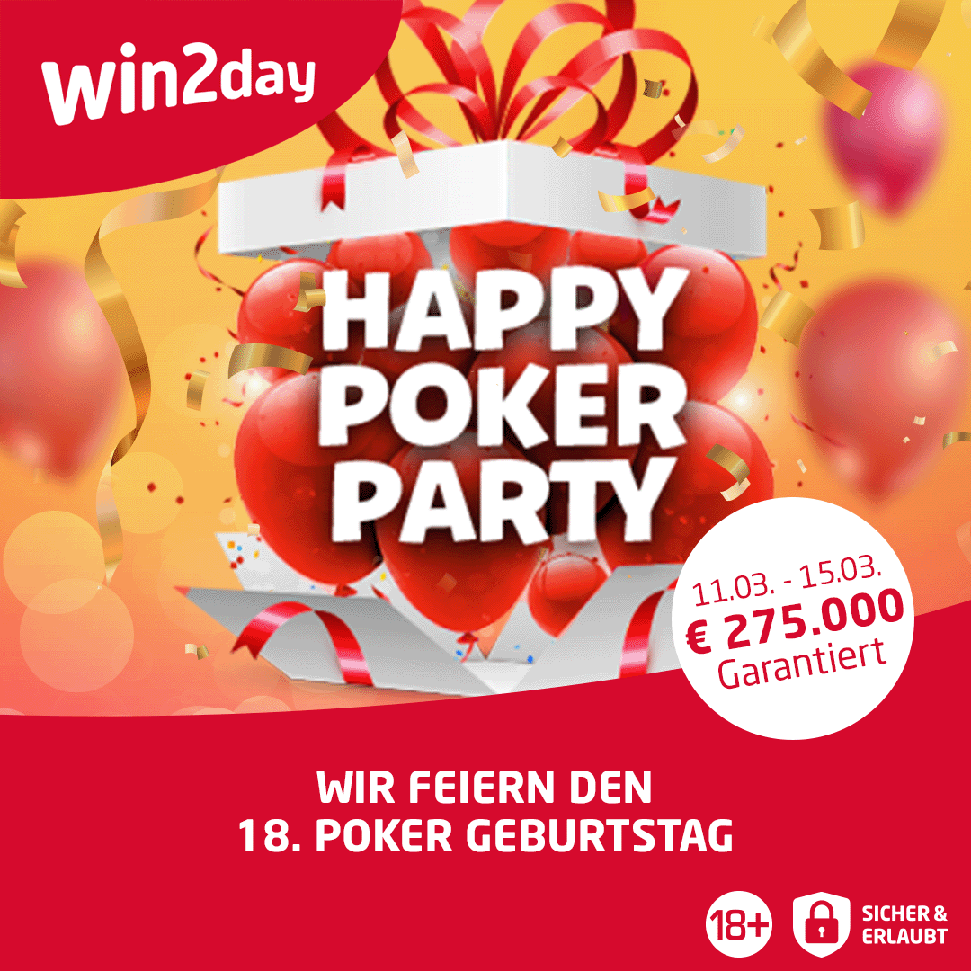 Die Happy Poker Party glänzt am Wochenende mit dem € 100 Main Event am Samstag, bei dem € 25.000 garantiert werden. Aber auch täglich gibt es Specials die sich sehen lassen können, die Buy-In Range reicht von € 5 bis € 500. Für die Turniere könnt Ihr Euch wie immer auch kostengünstig über die win-a-ticket Satellites zu Tickets spielen.