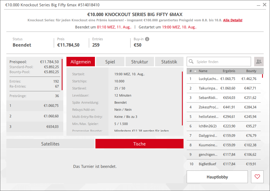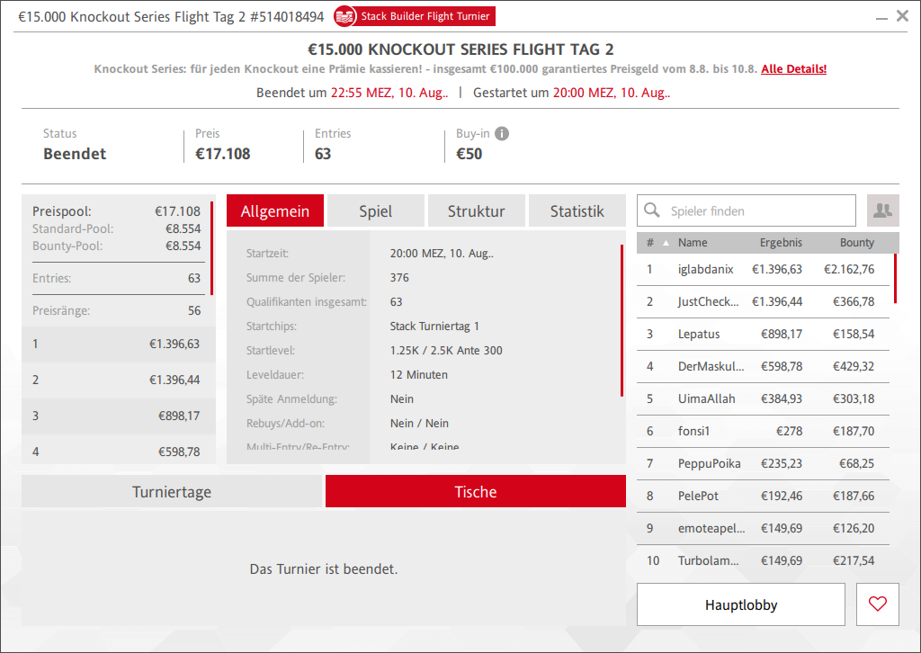 Locker hat man übrigens auch die Garantie beim € 50 Flight Turnier der Knockout Series übertroffen. 376 Entries sorgten für € 17.108 im Pot, 63 Spieler starteten am Sonntag Abend ins Finale. Zunächst ging es um die 56 Geldränge, der Sieg ging schließlich an iglabdanix für € 1.396 + € 2.162.