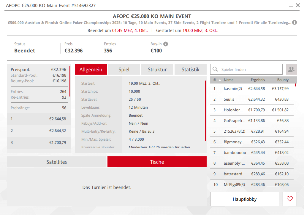 Fr, 03.10., 19:00 Uhr€ 25.000 KO Main Event€ 50€ 25.000