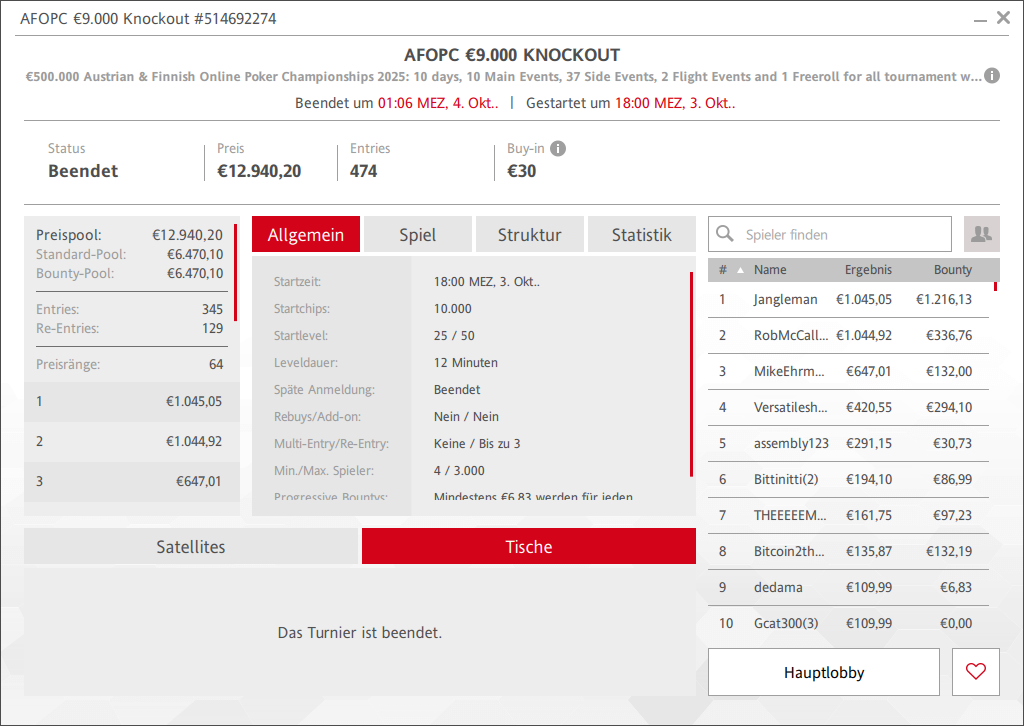 So, 05.10., 18:00 Uhr€ 9.000 Knockout€ 30€ 9.000