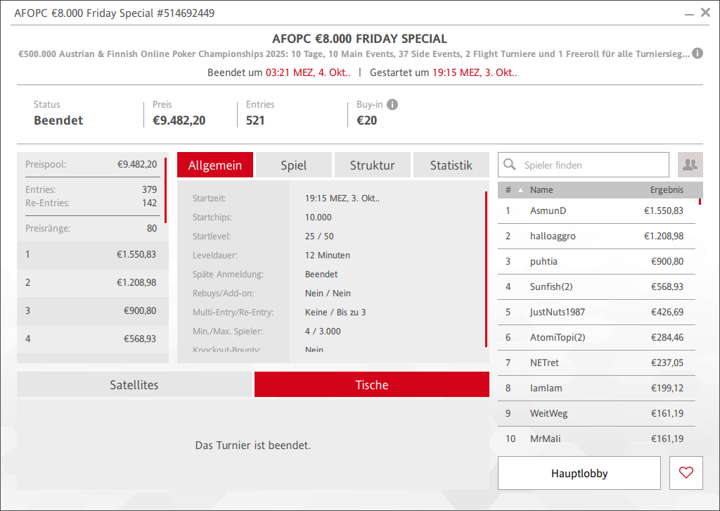 Fr, 03.10., 20:00 Uhr€ 6.000 Rebuy€ 10€ 6.000