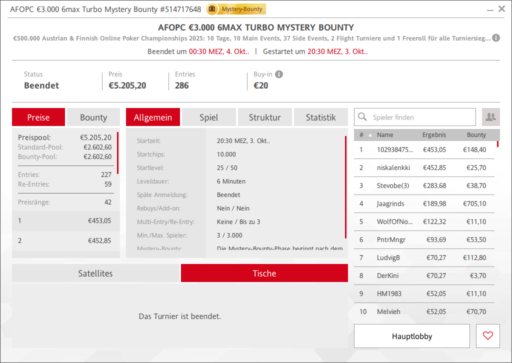 Sa, 04.10., 19:00 Uhr€ 25.000 6max Main Event€ 100€ 25.000