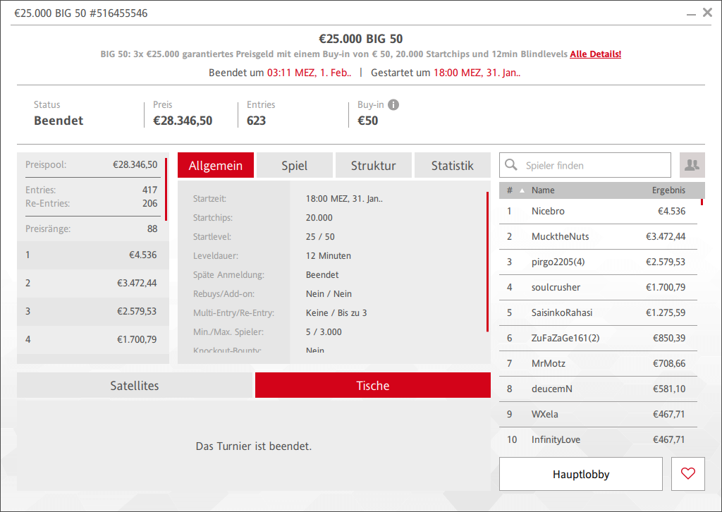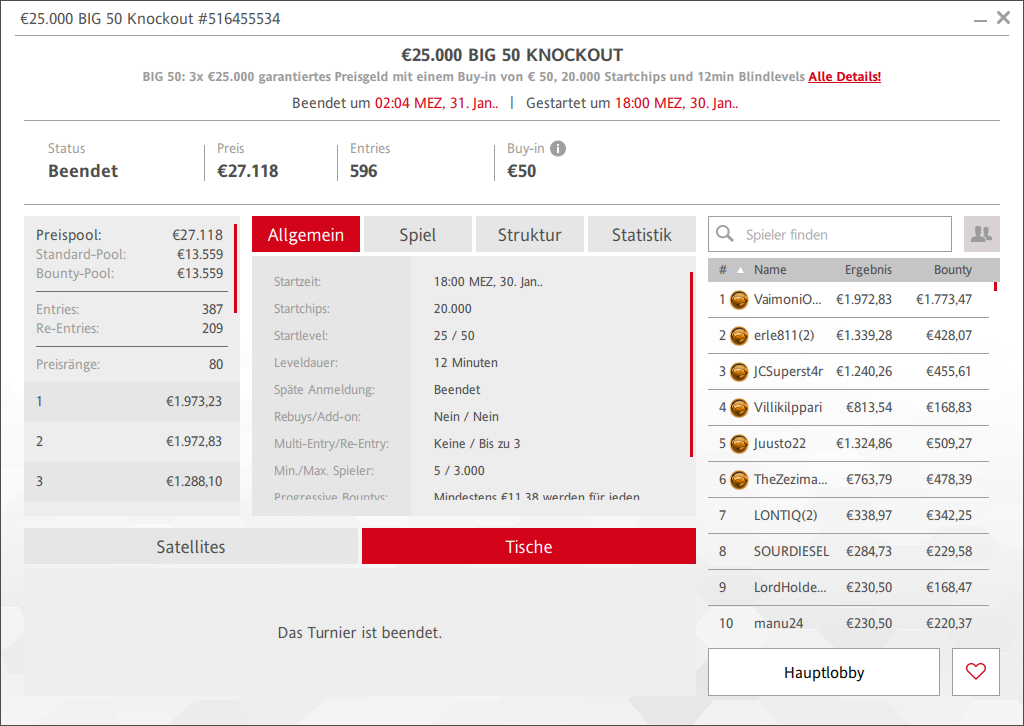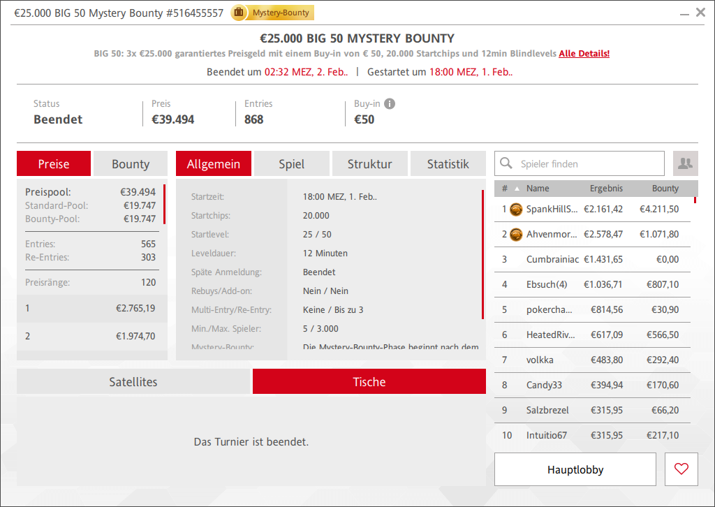 Die drei € 50 Big 50 Turniere hatten jeweils € 25.000 als Preisgeldgarantie. Beim Big Knockout am Freitag waren es schon € 27.118 im Pot, beim klassischen Big 50 am Samstag € 28.346 und beim € 50 Big Mystery Bounty am Sonntag waren es dann unglaubliche 868 Entries und damit € 39.494 Preisgeld.
