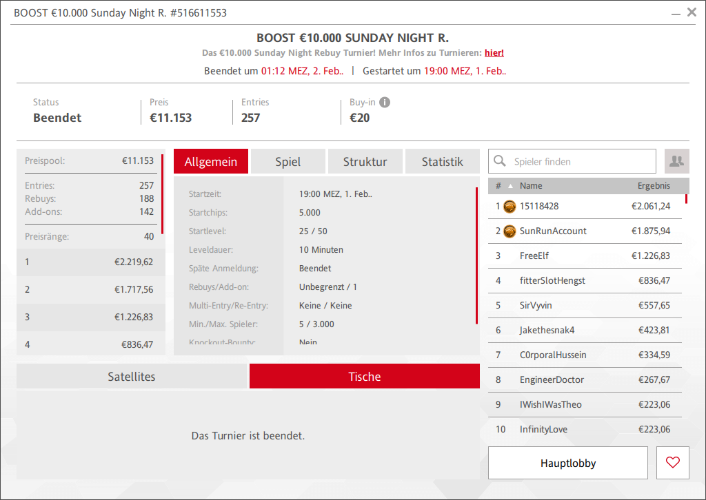 | So, 08.02., 18:00 Uhr | € 10.000 Sunday KO | € 30 | € 10.000 |