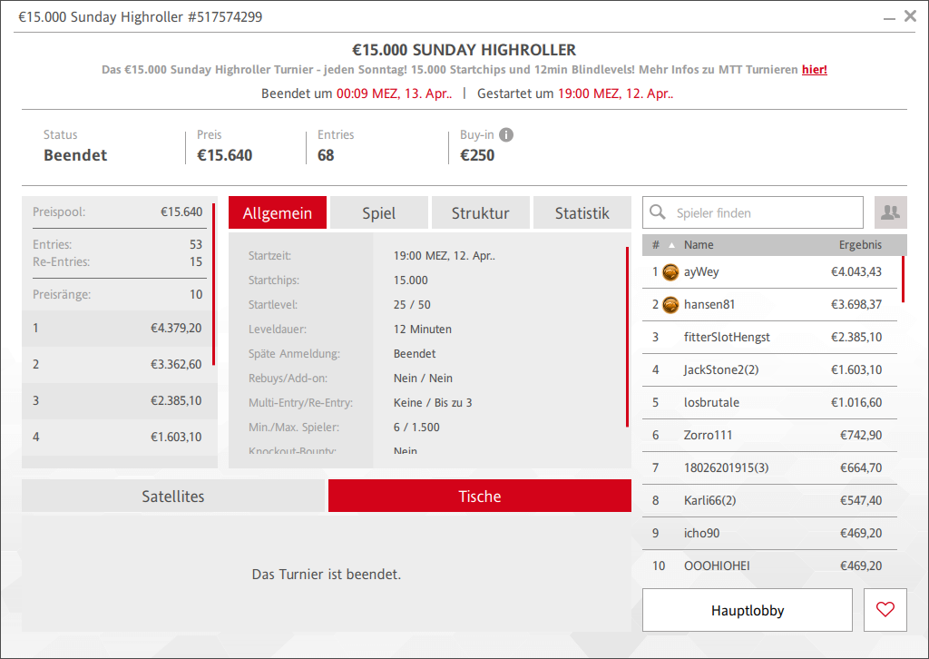 | So., 19.04., 19:30 Uhr | Highroller | € 250 | € 20.000 |