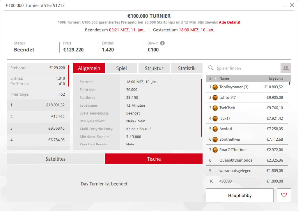 Mit starken Zahlen hat win2day 2025 beendet und auch 2026 startete man mit durchwegs klar übertroffenen Preisgeldgarantien bei der Neujahrstournee. Auch das erste 100k Turnier versprach ein Spielermagnet zu sein und die Erwartungen wurden nicht enttäuscht. 1.010 Teilnehmer leisteten das Buy-In von € 100, dazu kamen noch 410 Re-Entries und so waren statt der garantierten € 100.000 gleich € 129.220 im Pot. Die top 152 Plätze waren bezahlt, € 18.091 hätte der Sieger erhalten. Die letzten sieben aber einigten sich auf einen Deal, der Sieg ging an TopiRyynanen, der sich mit seiner dritten Bullet die Siegprämie von € 10.803 sichern konnte.