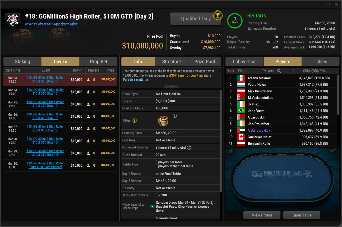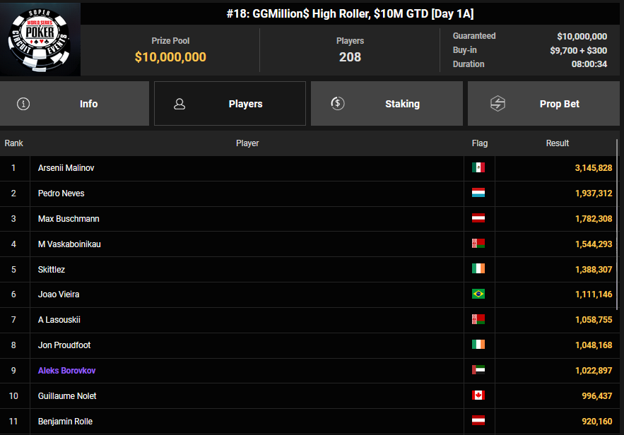 Begonnen hat auch das $10.000 GGMillion$ High Roller (#18). Hier werden insgesamt neun Flights gespielt, mit 208 Entries an Tag 1A hat man schon eine solide Basis für die garantierten $10.000.000 geschaffen. Als bester Deutscher liegt Max Buschmann auf Rang 3, Arsenii Malinov ist der aktuelle Chipleader.