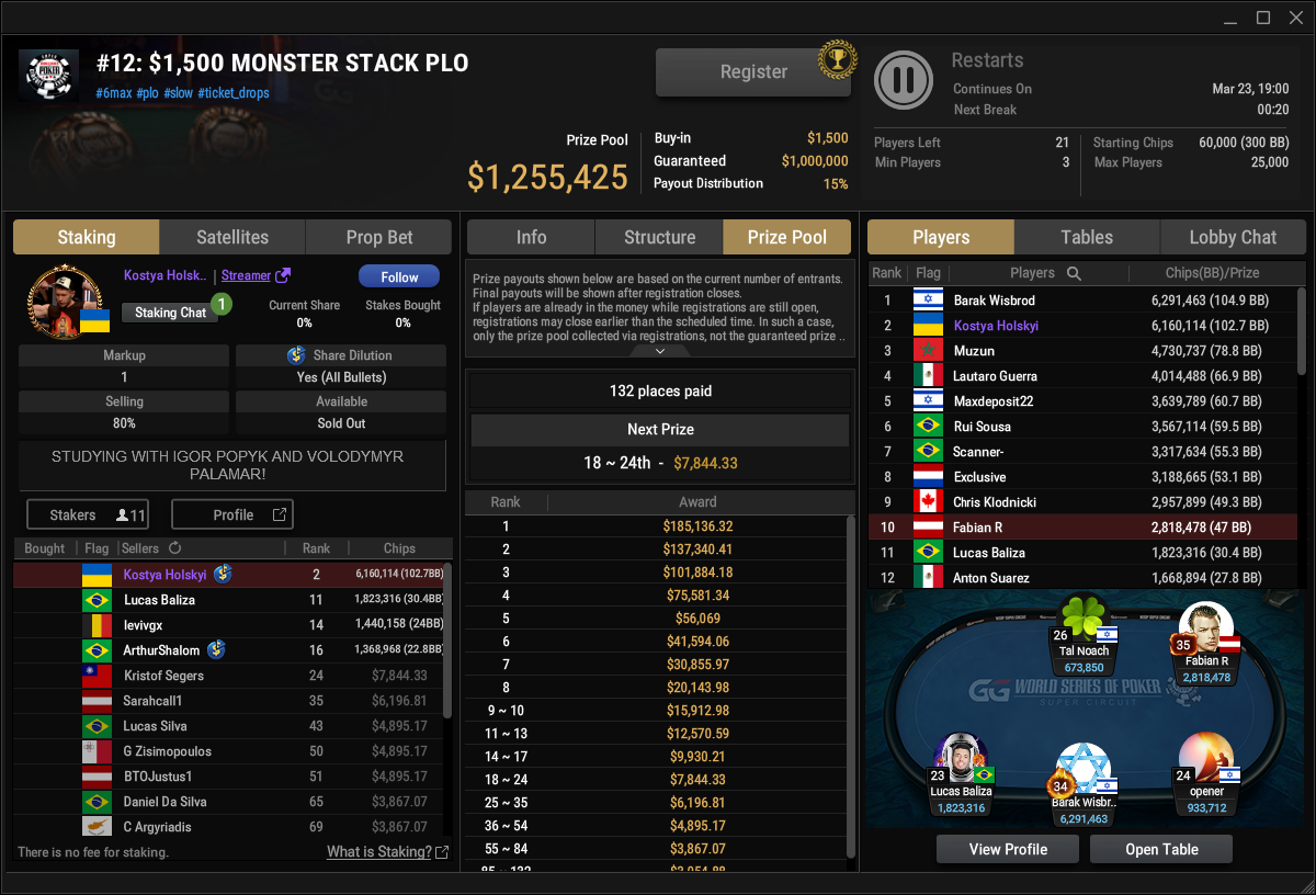 Beim $1.500 Monster Stack PLO (#12) geht es mit 21 Spielern heute in die Entscheidung. 881 Entries hatten für $1.255.425 Preispool gesorgt. Fabian R liegt als bester deutschsprachger Spieler auf Rang 10, wenn es ins Finale geht. Der Sieger kann sich auf $185.136 freuen.