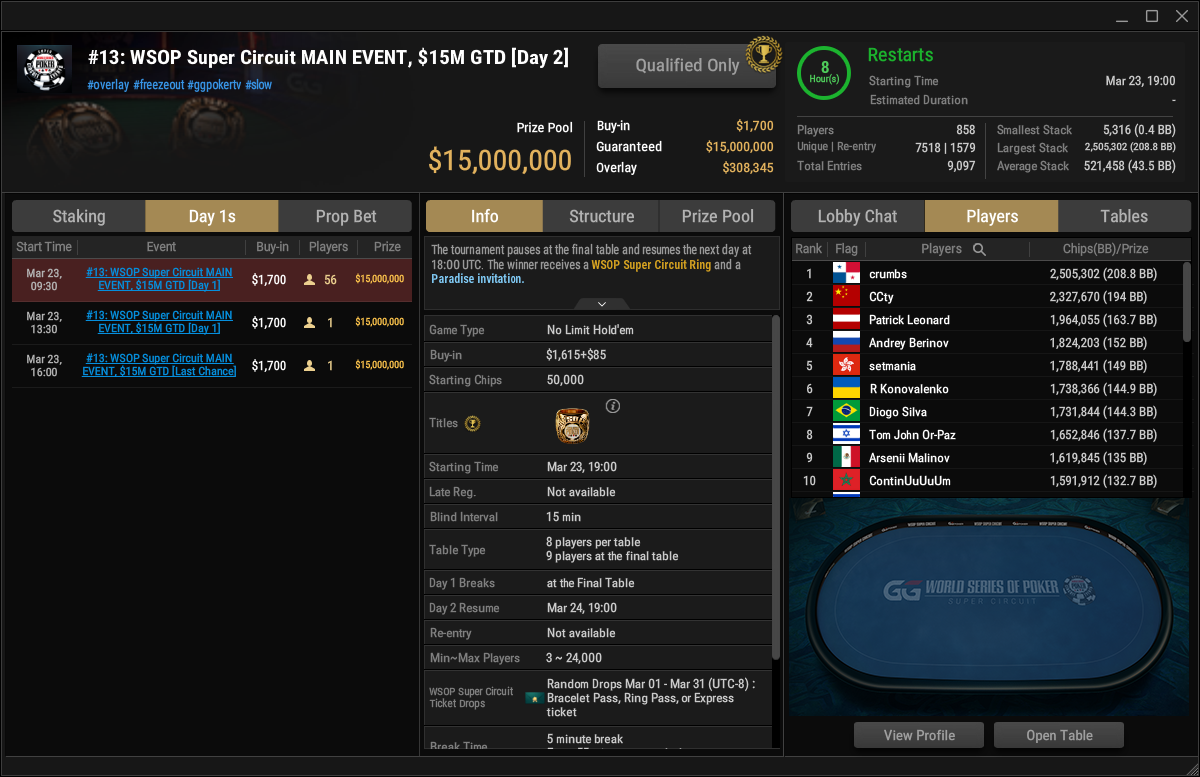 Die letzten Flights beim $1.700 Super Circuit Main Event stehen auch an, um 19 Uhr geht es dann schon in Tag 2. Die $15.000.000 Garantie ist noch nicht geknackt, allerdings ist der Overlay minimal und mit den letzten Flights sollte man noch darüber kommen.