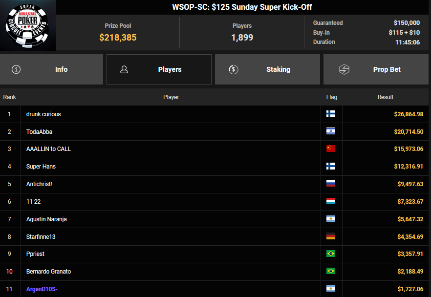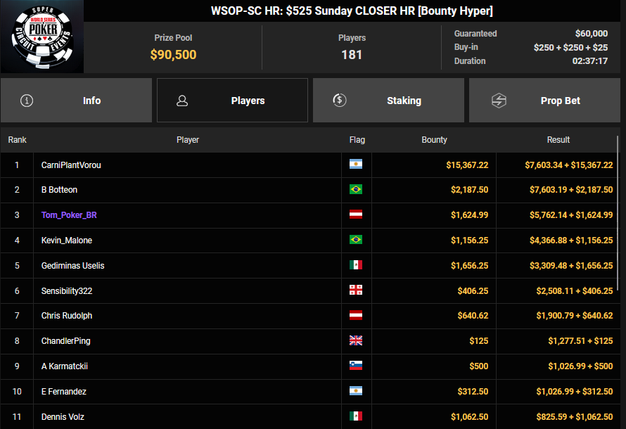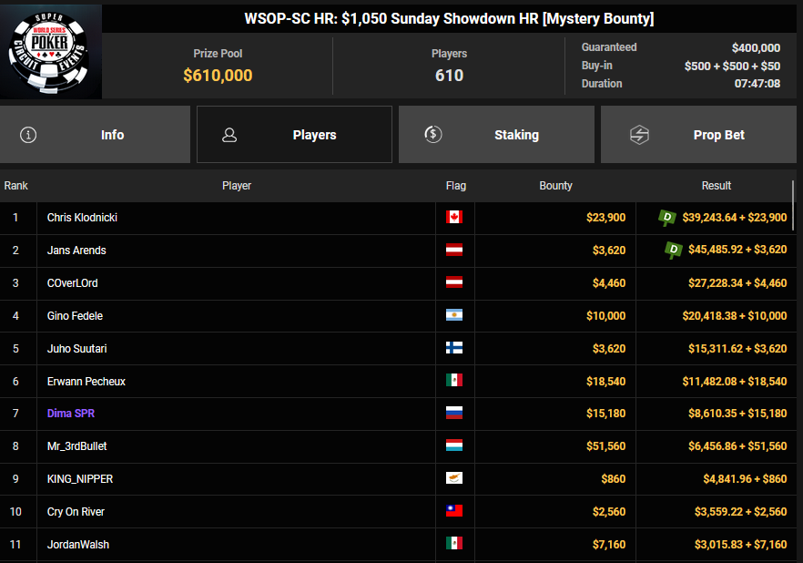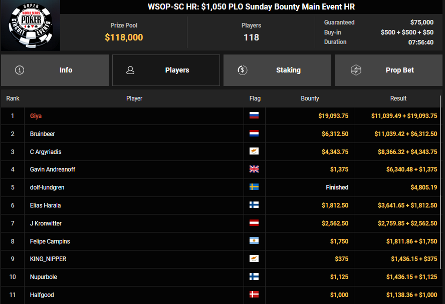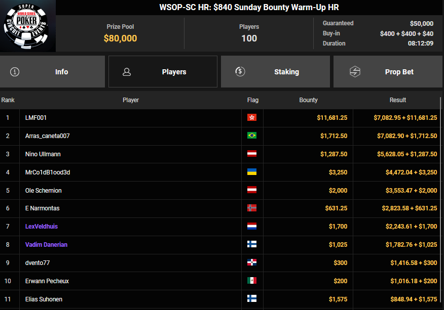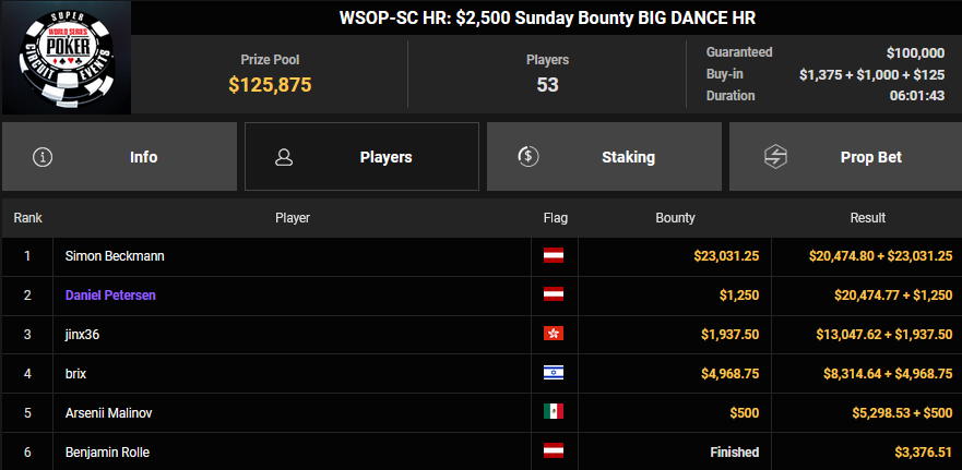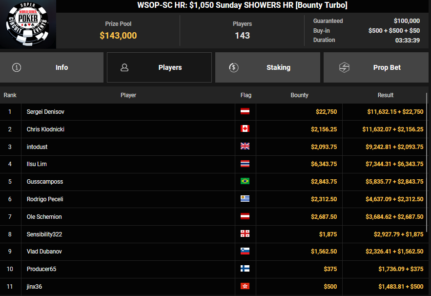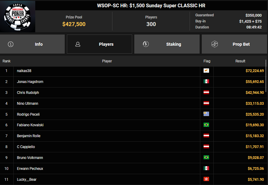 Nino Ullmann kam beim $840 Bounty Warm-up HR auf Rang 3 für $5.628+ $1.287 und kassierte beim $1.500 Sunday Super Classic HR für Rang 4 noch $33.115. Christian Rudolph kam hier auf Rang 3 für $42.944.