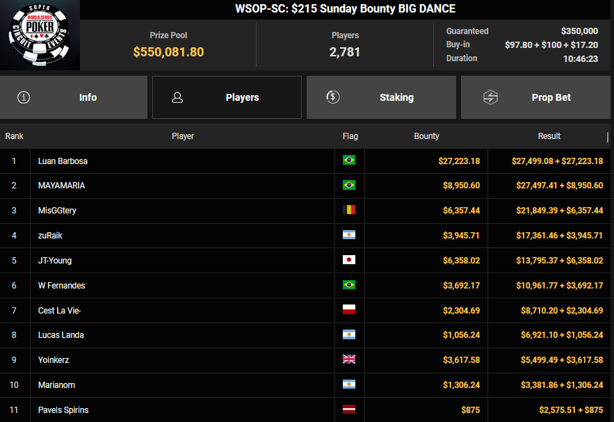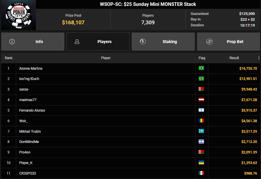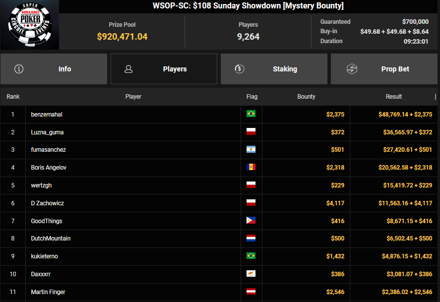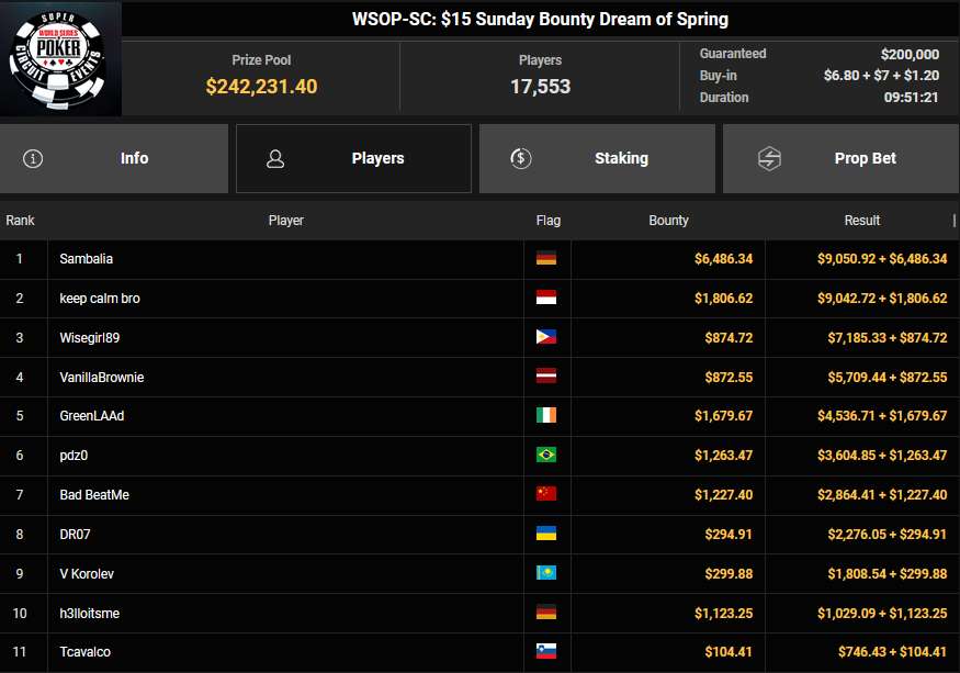 Und dann waren da wieder die vielen Side Events. madmax77 verpasste beim $25 Mini Monster Stack das Podest, nahm aber $7.671 für Rang 4 mit. Sambalia holte den Sieg beim $15 Sunday Bounty Dream of Spring und kassierte $9.050 + $6.486.
