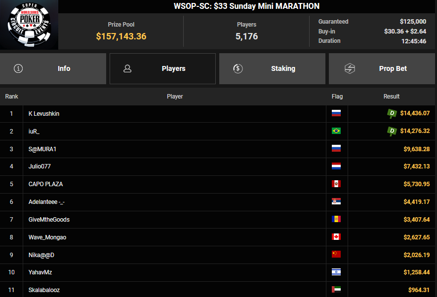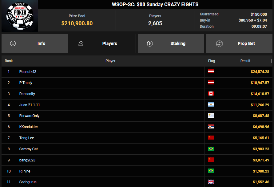 Naaaturally teilte beim $125 Grand Prix für $35.076, Peanutz43 siegte beim $88 Sunday Crazy Eights für $24.574, Alex Tkatschew nahm beim $888 Crazy Eights HR $6.605 für Rang 3 mit.