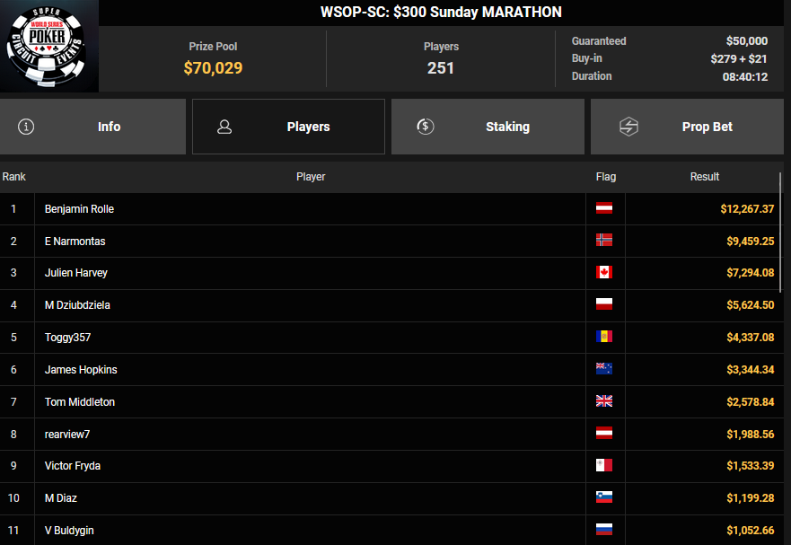 Benjamin Rolle holte den Sieg beim $300 Sunday Marathon für $12.267 und wurde beim $1.500 Grand Prix HR Runner-up für $20.823, Daniel Smiljkovic kam auf Rang 3 für $17.534.