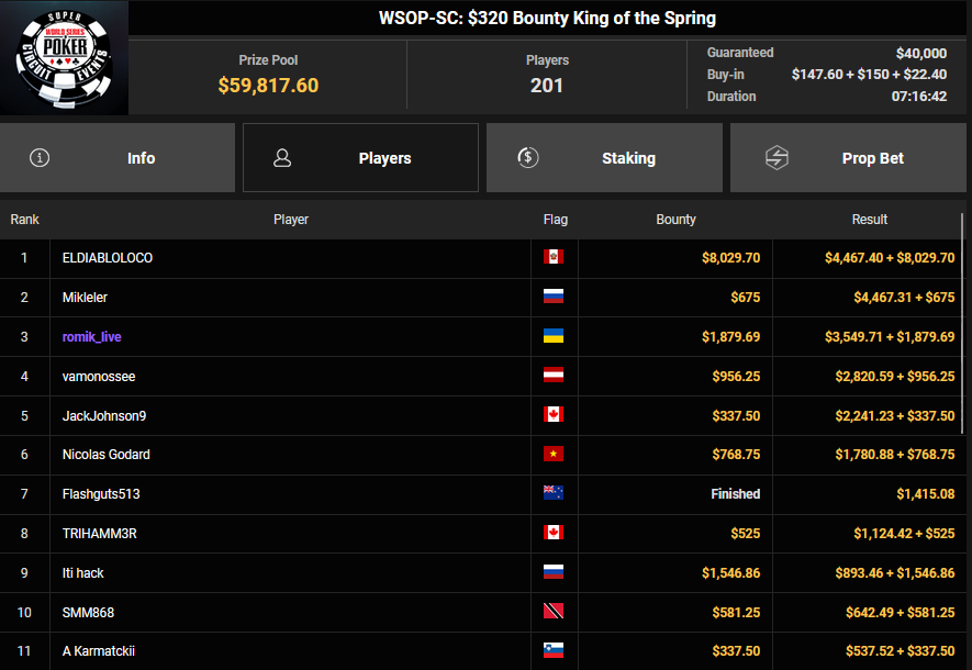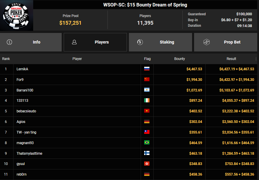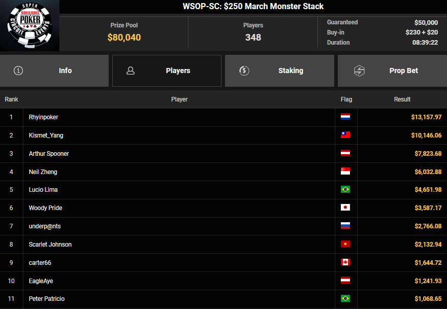 Fette Schecks gab es auf jeden Fall auch bei den Side Events. schon beim $250 Monster Stack holte Arthur Spooner Rang 3 für $7.823, HeXagon_ belegte Rang 2 beim $125 Spring Marathon ($12.105), Lune33 Rang 3 für $9.334.