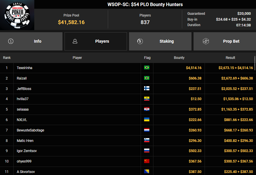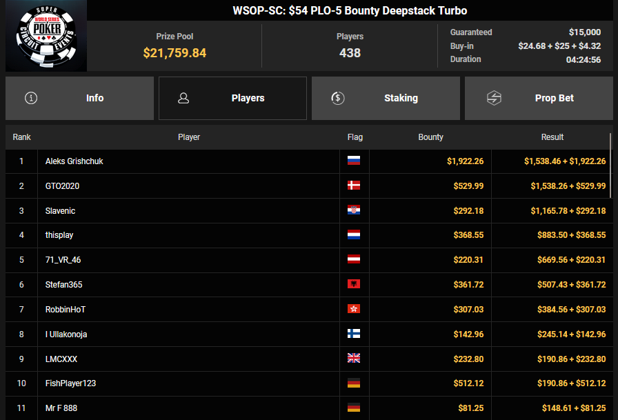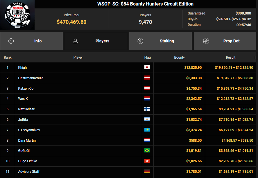 Doamneajuta! furde Dritter beim $100 PLO ($2.275), HastrmanKebule verpasste den Sieg bei der $54 Bounty Hunters Circuit Edition. Hier waren es massive 9.470 Entries und so gab es $19.342 + $5.303 für Paltz 2, KatzenKlo konnte als Dritter noch $15.369 + $4.750 mitnehmen.
