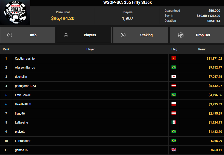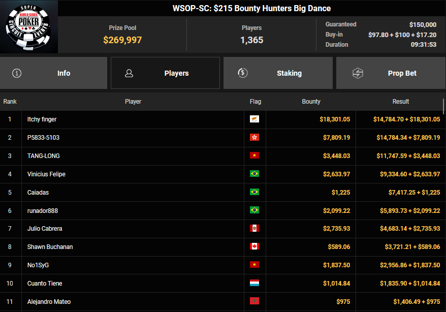 Chris Nguyen lag auf Rang 2, als es gestern für noch 81 Spieler der 4.096 Entries beim $500 Kickoff (#1) ins Finale ginge. $212.934 warteten auf den Sieger, aber es war letztlich Gabriel Bardini, der sich den Sieg abholen konnte. Auch für ihn gab es das gesponserte $5k WSOPP Package. Chris Nguyen mussten sich mit Rang 8 für $34.679 begnügen, IcePunishU kam als bester Deutscher auf Rang 6 ($58.324).
