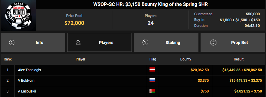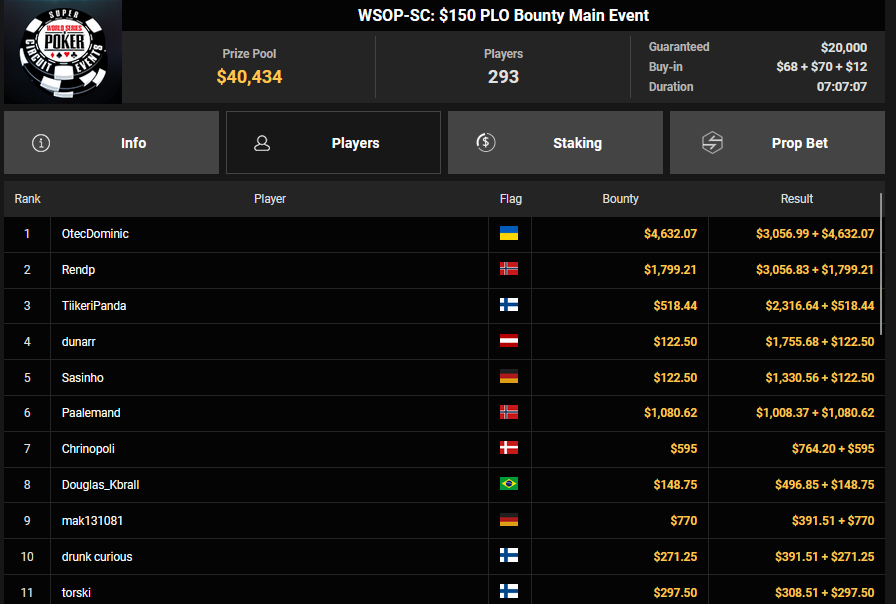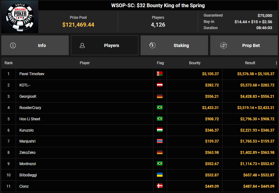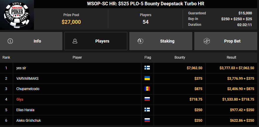 Starfinne13 wurde beim $108 Freezeout Runner-up für $10.356 + $1.164, KOTL– belegte beim $32 Bounty King Rang 2 für $5.573 + $282, GeorgiosK nahm für Rang 3 $4.428 + $556 mit.
