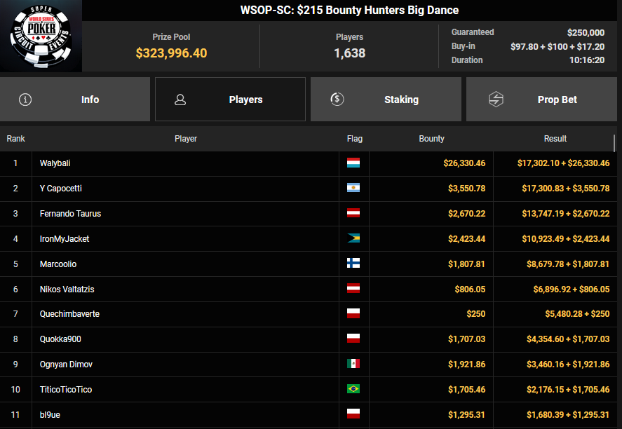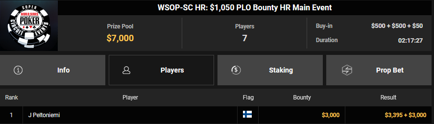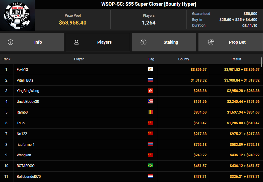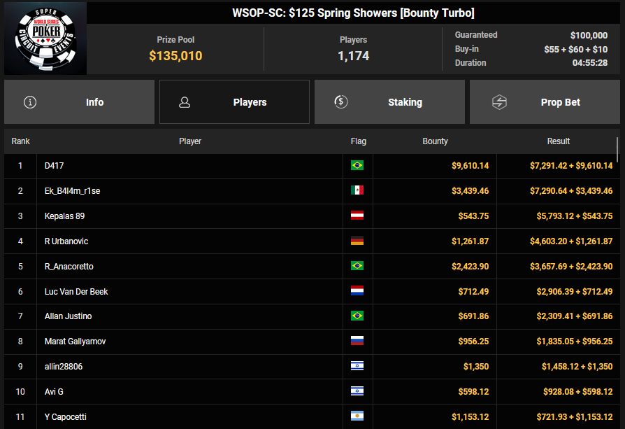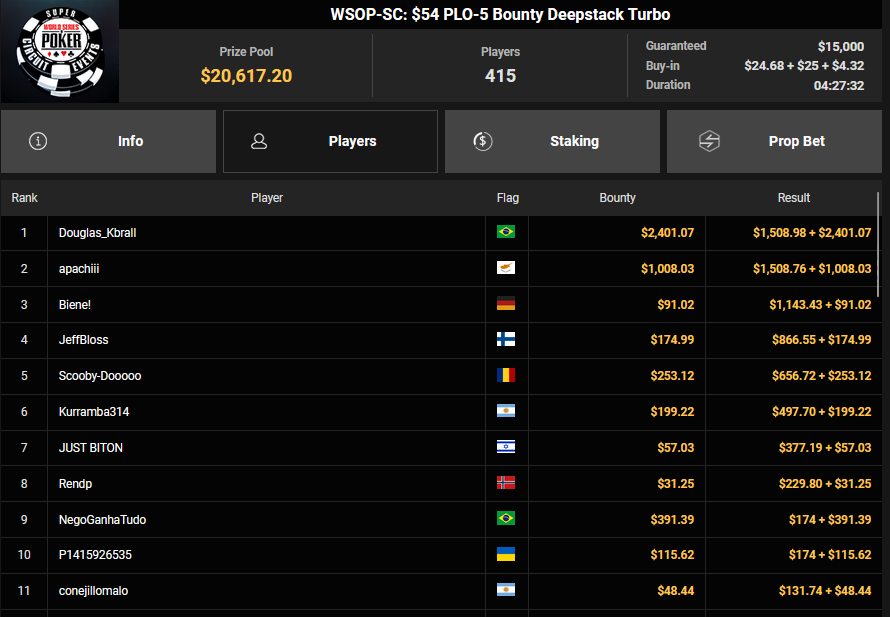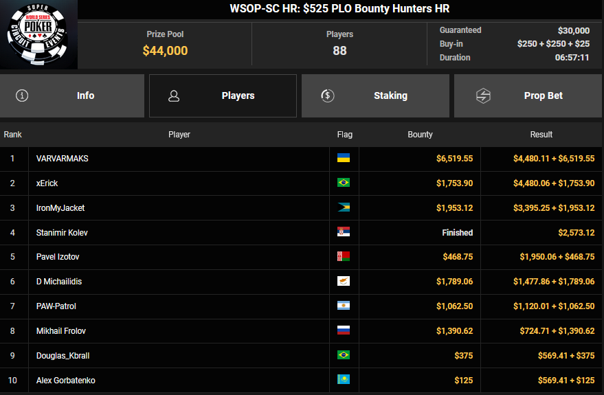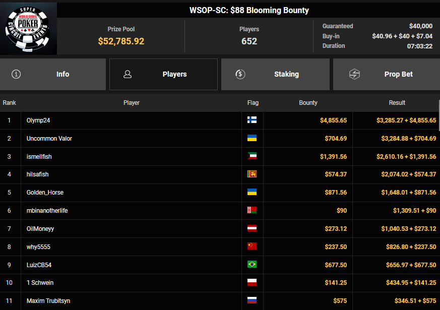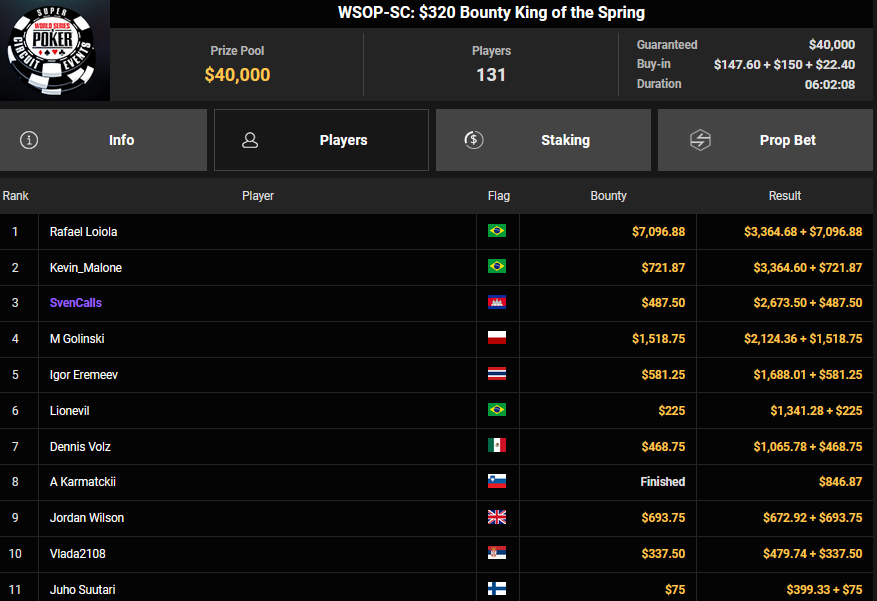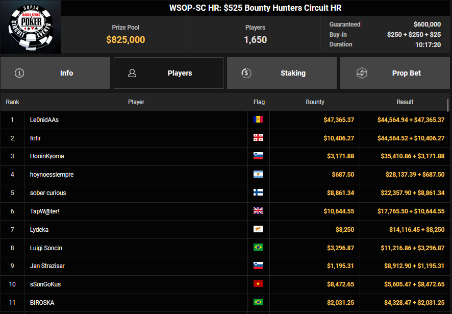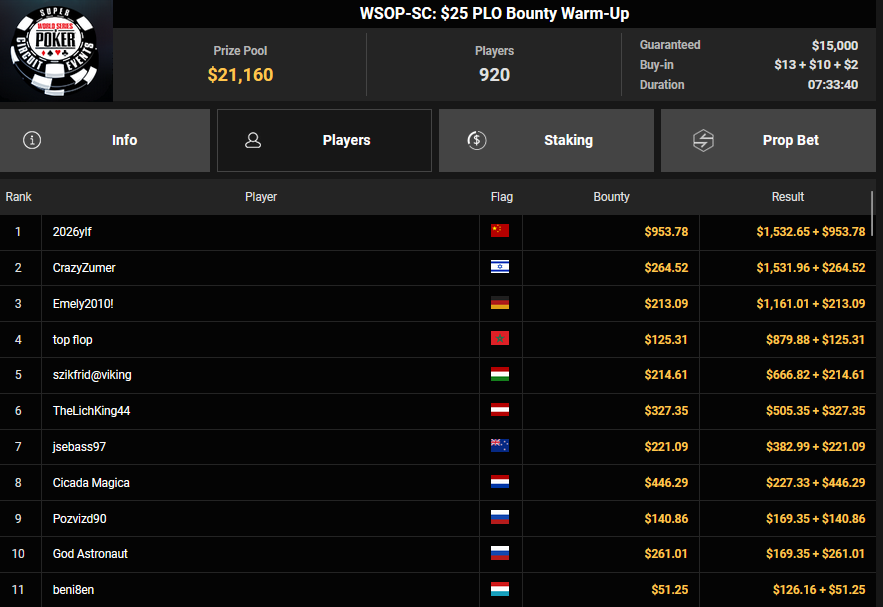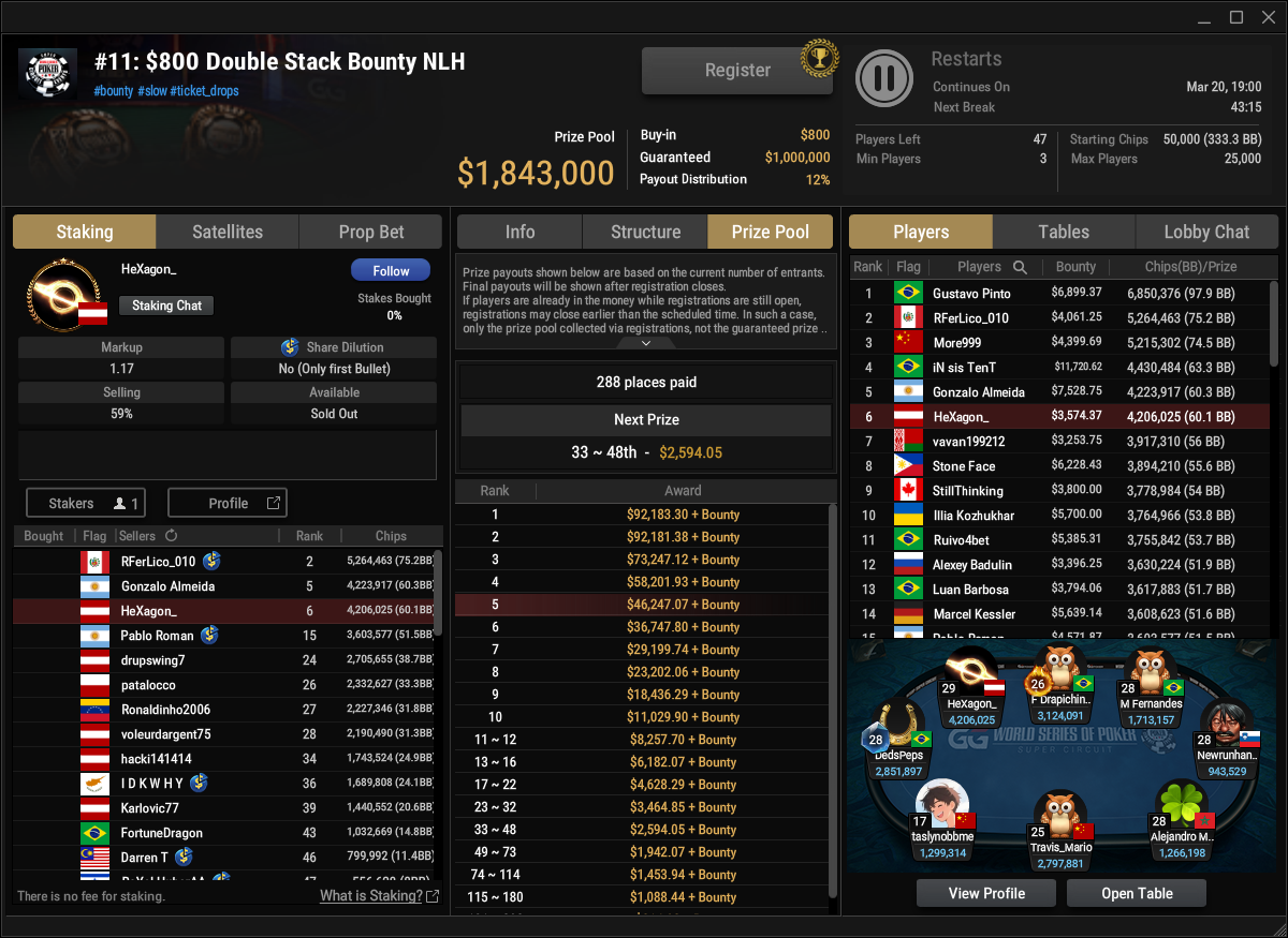 Beim $800Double Stack Bounty war der Ansturm wieder groß, 2.425 Entries sorgten für einen Preispool von $1.843.000. Noch sind es aber auch 47 Spieler, die heute auf den Ring und $92.183 + Bounty + $5k WSOPP Package hoffen dürfen. HeXagon_liegt auf Rang 6, Marcel Kessler auf Rang 14.
