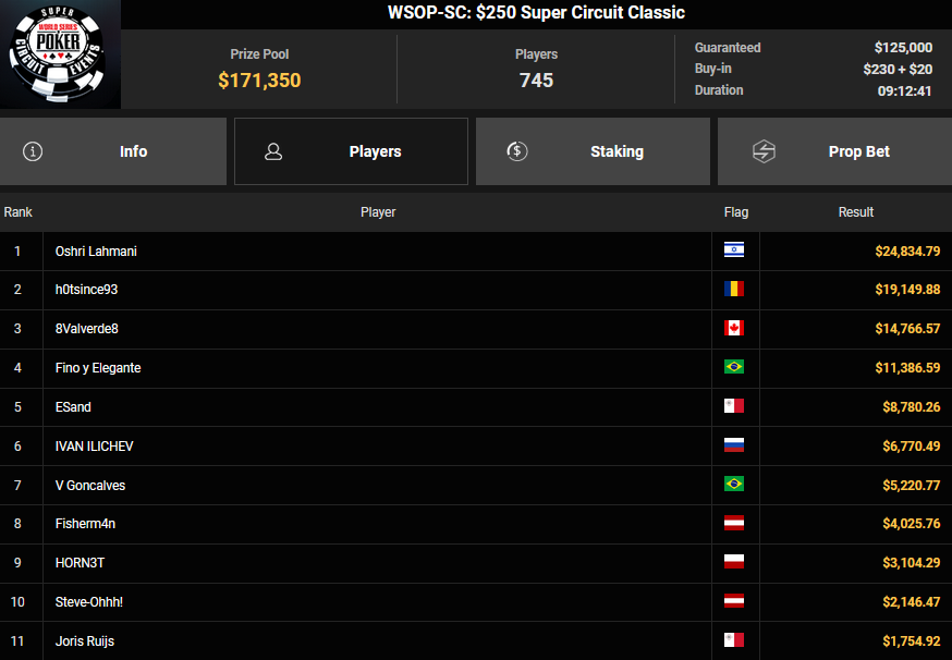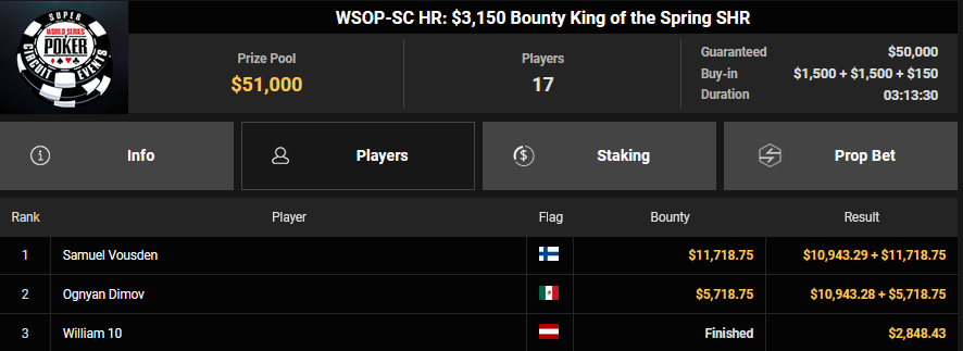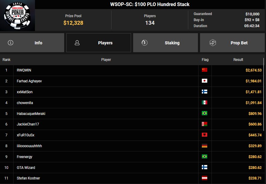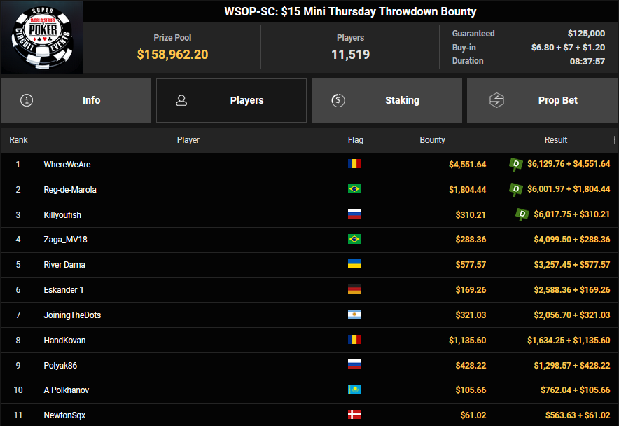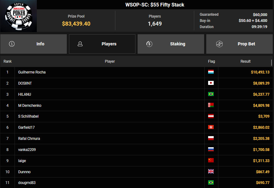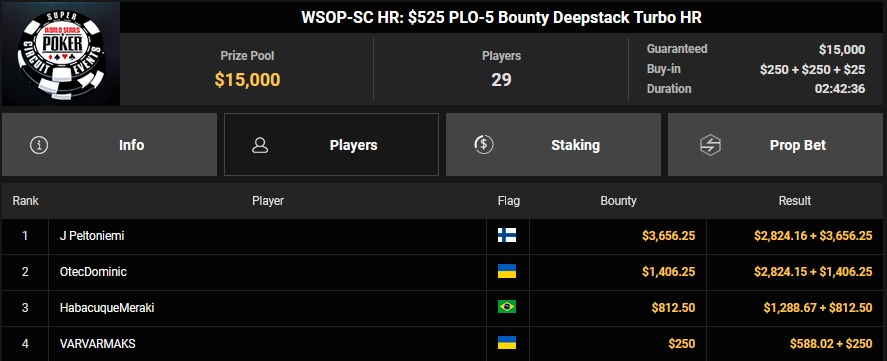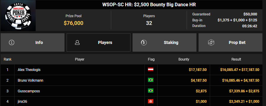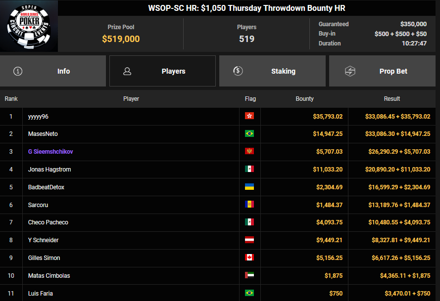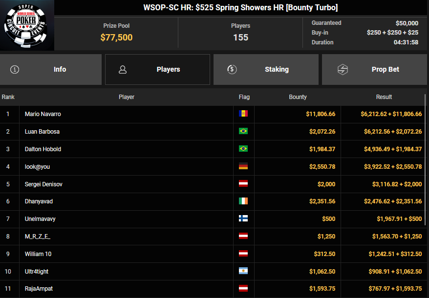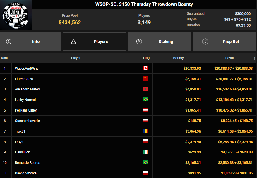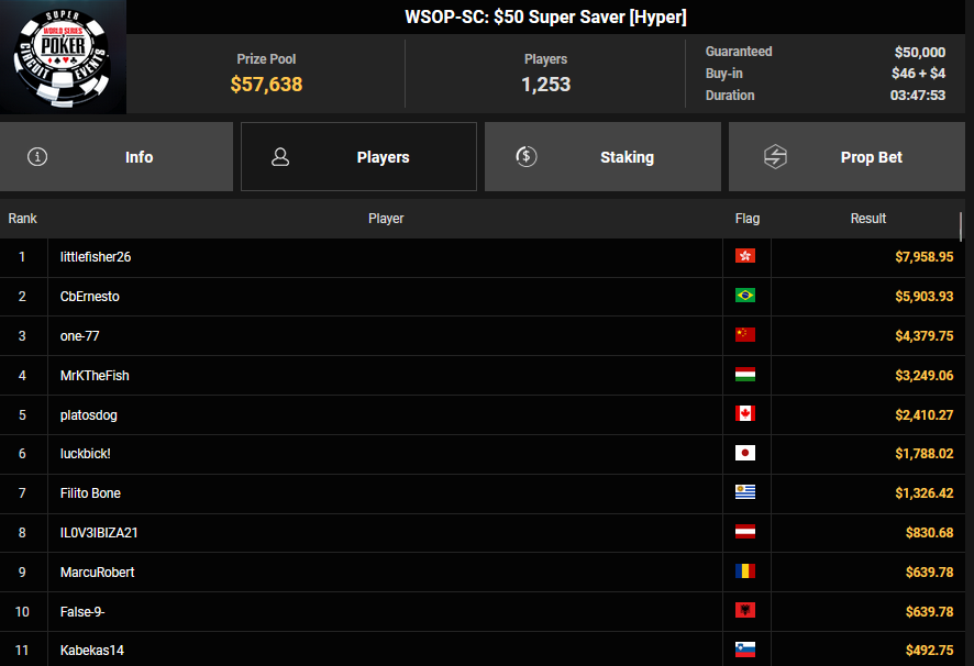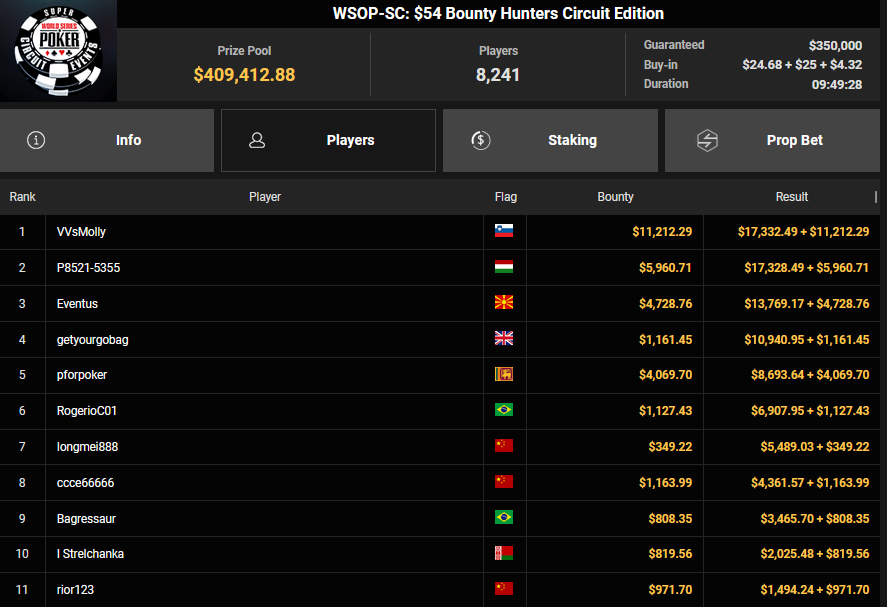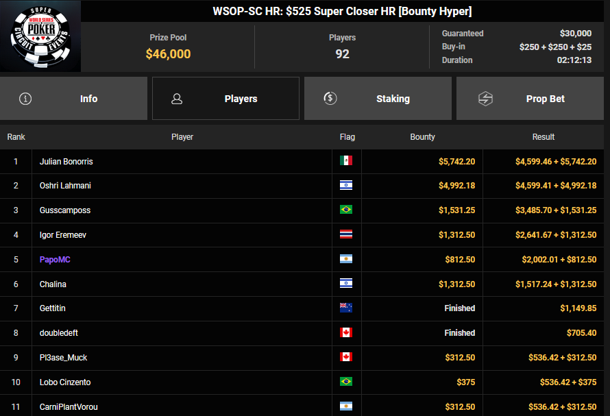 Beim $800Double Stack Bounty war der Ansturm wieder groß, 2.425 Entries sorgten für einen Preispool von $1.843.000. Noch sind es aber auch 47 Spieler, die heute auf den Ring und $92.183 + Bounty + $5k WSOPP Package hoffen dürfen. HeXagon_liegt auf Rang 6, Marcel Kessler auf Rang 14.