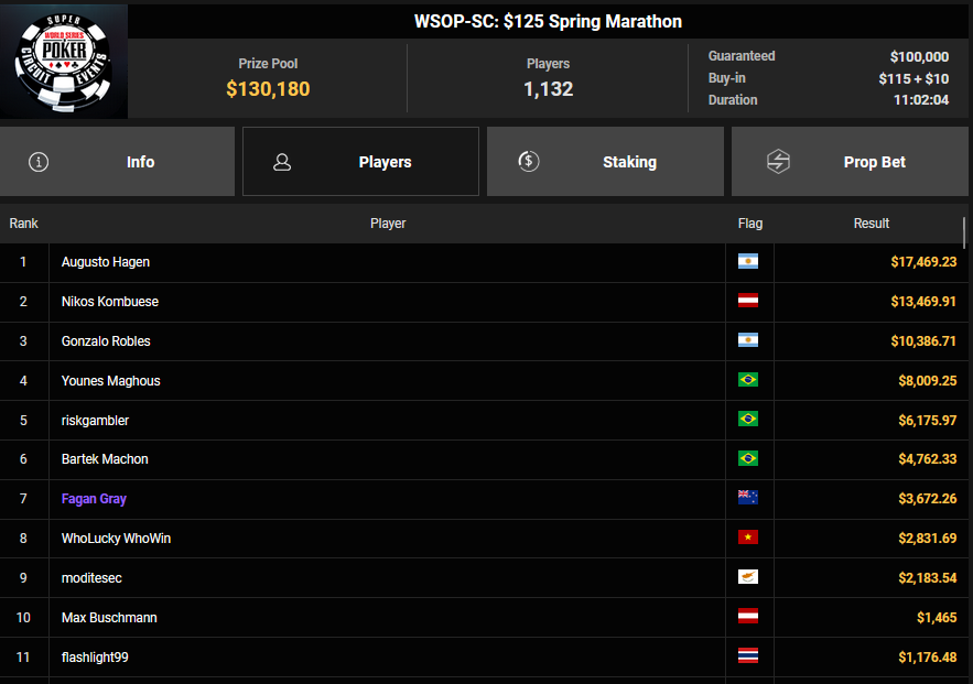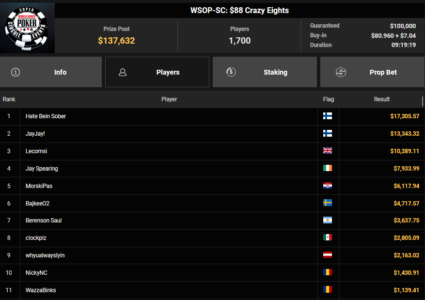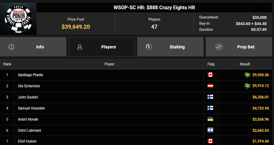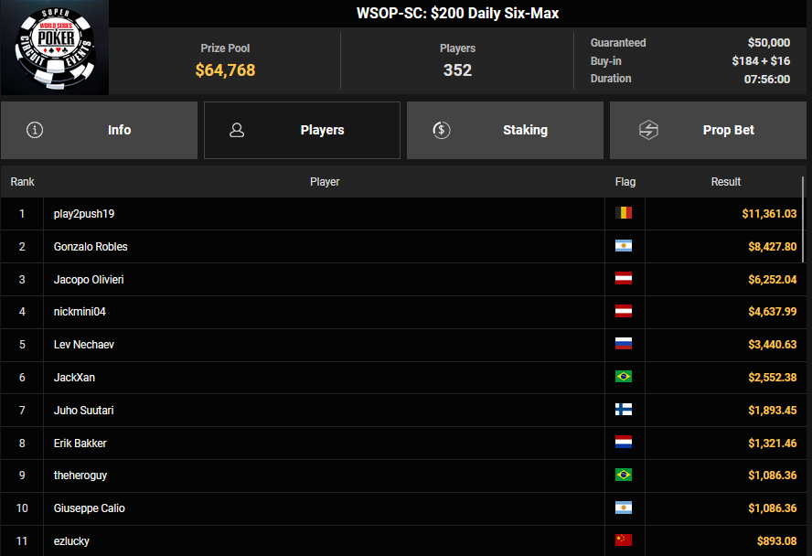 nickmini04 verpasste das Podest beim $200 Daily Six-Max, Platz 4 zahlte aber auch noch satte $4.637. Auch Simon Beckmann kam beim $2.100Daily Six Max nur auf Rang 4 ($9.875), Ole Schemion wurde beim $888 Crazy Eights Runner-up für $9.910.