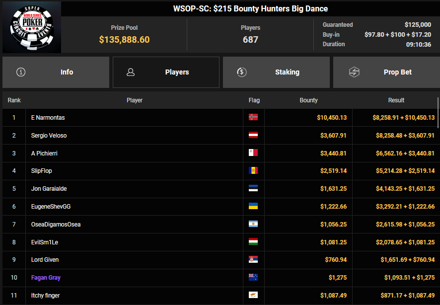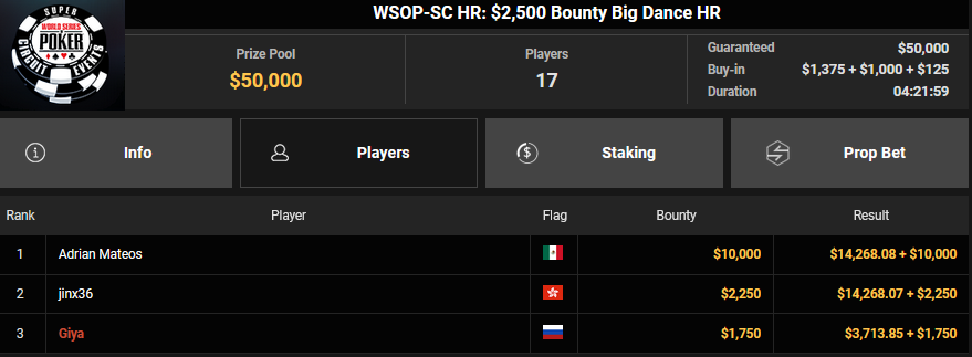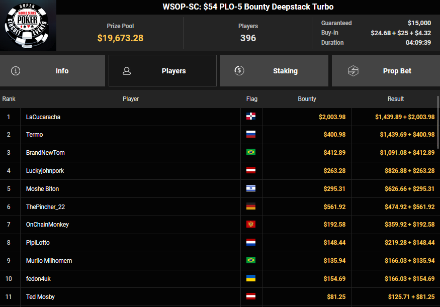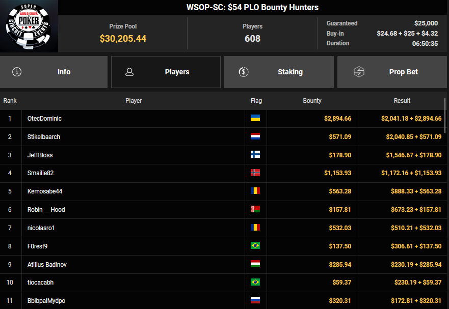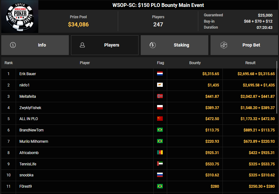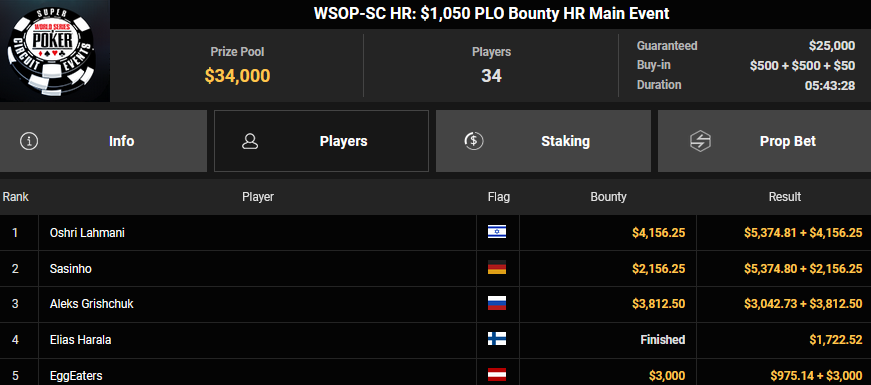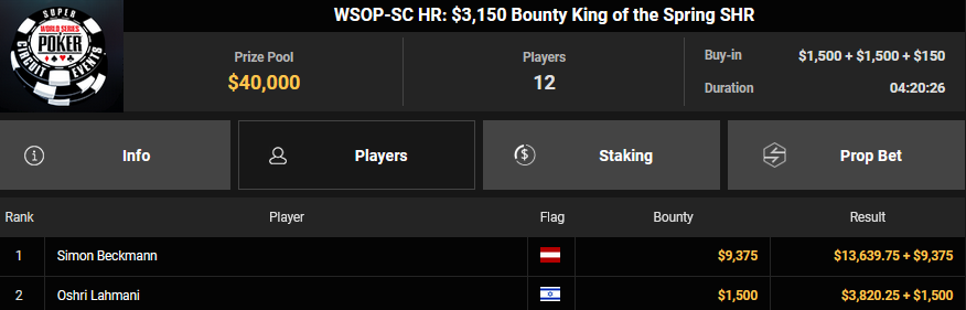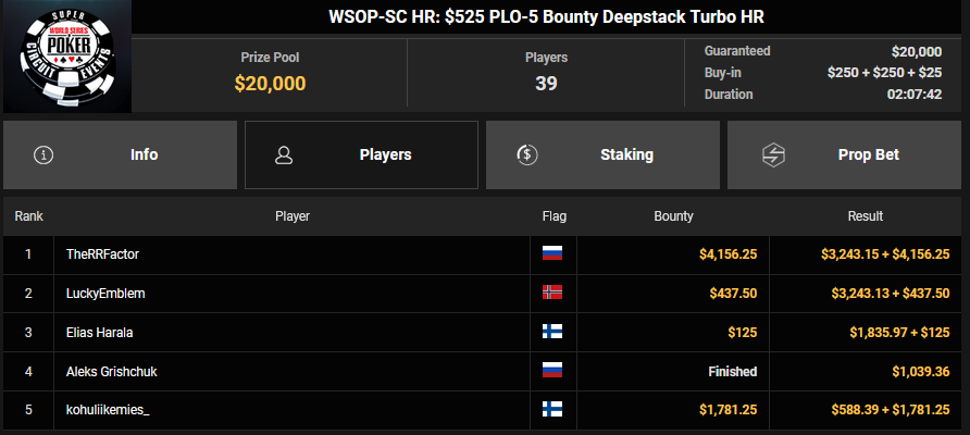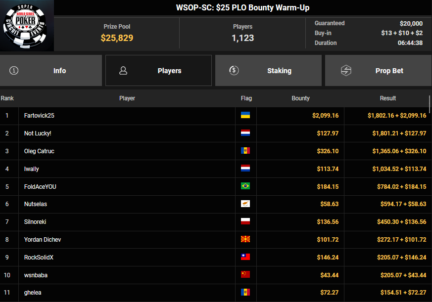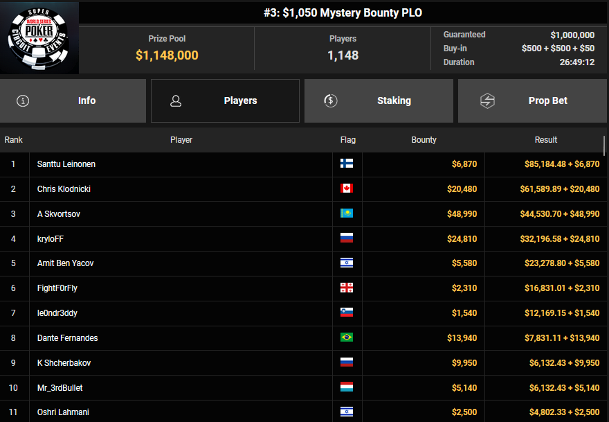 Nur 13 Spieler waren beim $1.050 Mystery Bounty PLO von den 1.148 Entries noch übrig, Marcel Kessler startete von Rang 5 aus, zudem war auch der Luxemburger Mr_3rdBullet noch dabei. Für Marcel war das Finale schnell vorbei, er kam über Rang 12 ($4.802 + $9.380) nicht hinaus, auch Mr_3rdBullet landete nur auf Ran g10 ($6.132 + $5.140). Der Sieg für $85.184 + $6.870 + $5k WSOPP Package ging an den Finnen Santtu Leinonen.