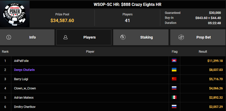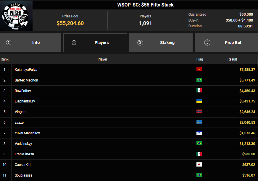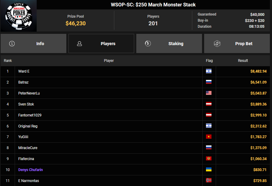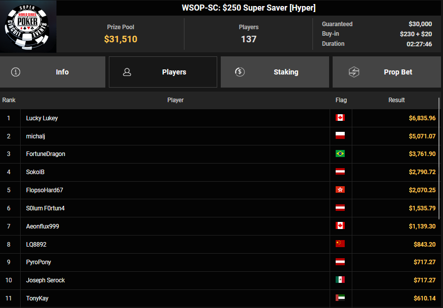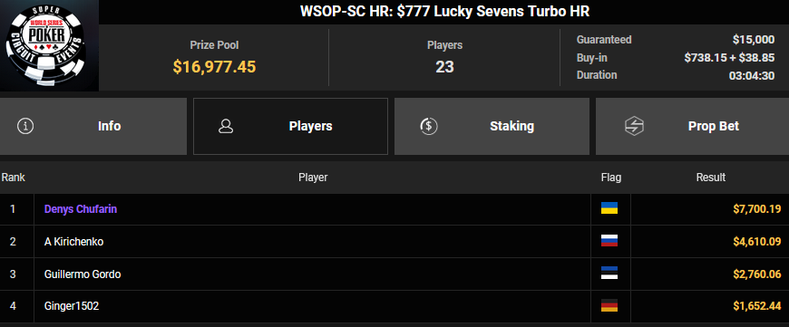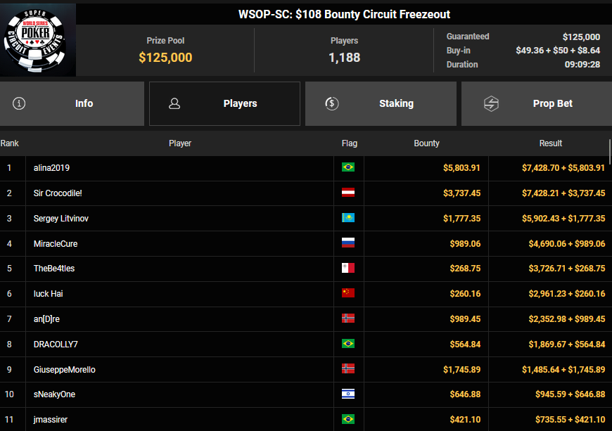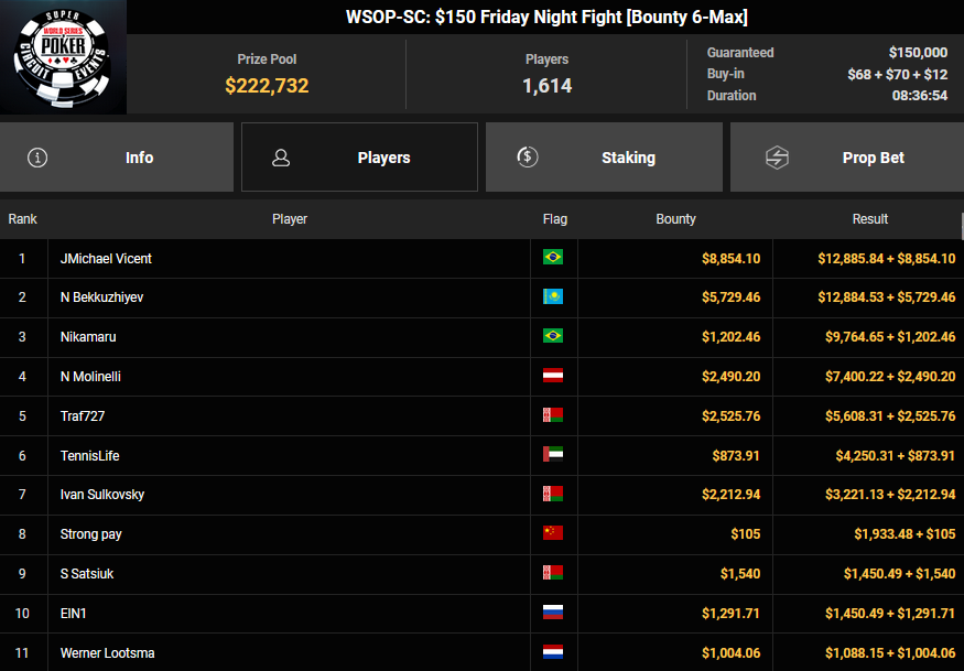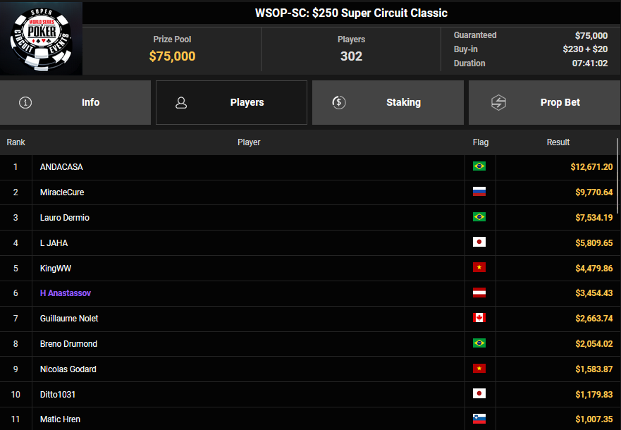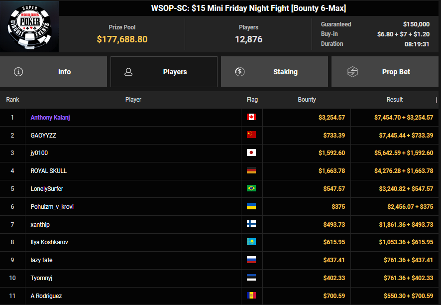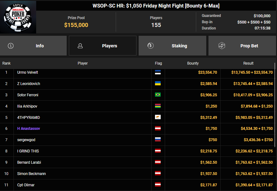Nur 13 Spieler waren beim $1.050 Mystery Bounty PLO von den 1.148 Entries noch übrig, Marcel Kessler startete von Rang 5 aus, zudem war auch der Luxemburger Mr_3rdBullet noch dabei. Für Marcel war das Finale schnell vorbei, er kam über Rang 12 ($4.802 + $9.380) nicht hinaus, auch Mr_3rdBullet landete nur auf Ran g10 ($6.132 + $5.140). Der Sieg für $85.184 + $6.870 + $5k WSOPP Package ging an den Finnen Santtu Leinonen.