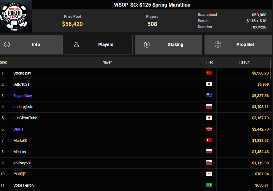 Bei den Side Events waren die DACHs gestern nicht so erfolgreich, ein paar top Platzierungen gab es aber.  ociJN wurde beim $15 Bounty Dream Runner-up für $5.590 + $614, PyroPony belegte beim $100 PLO Hundred Stack Rang 3 für $1.837.