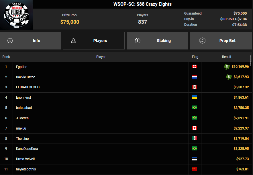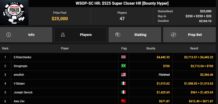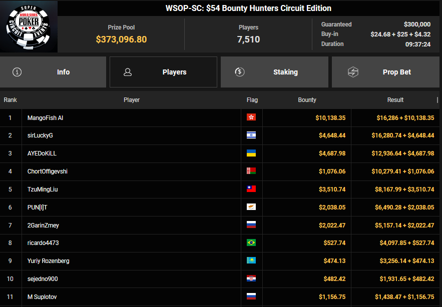ROYAL SKULL machte aus den $15 beim Mini Friday Night Fight Platz 4 für $4.276 + $1.663, Sir Crocodile! verpasste den Sieg beim $108 Bounty Circuit Freezeout ($7.428 + $3.737).