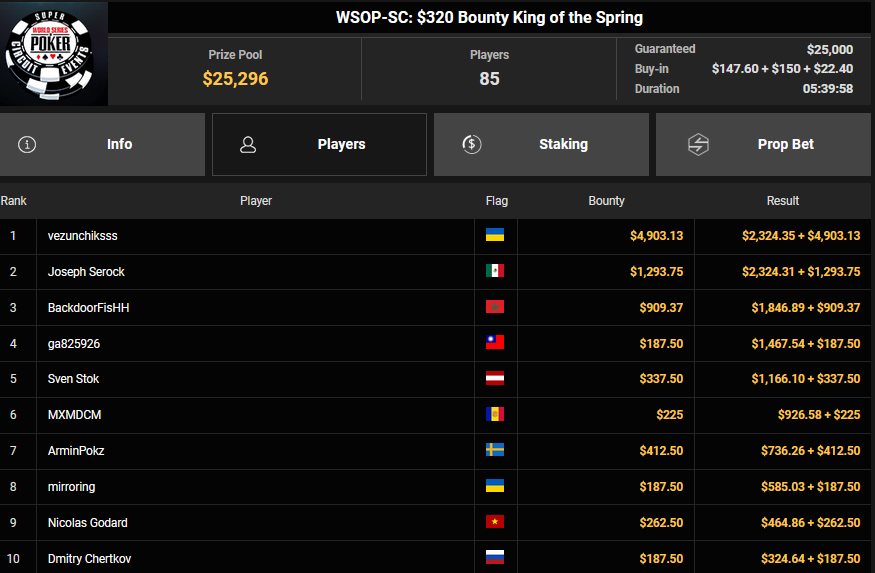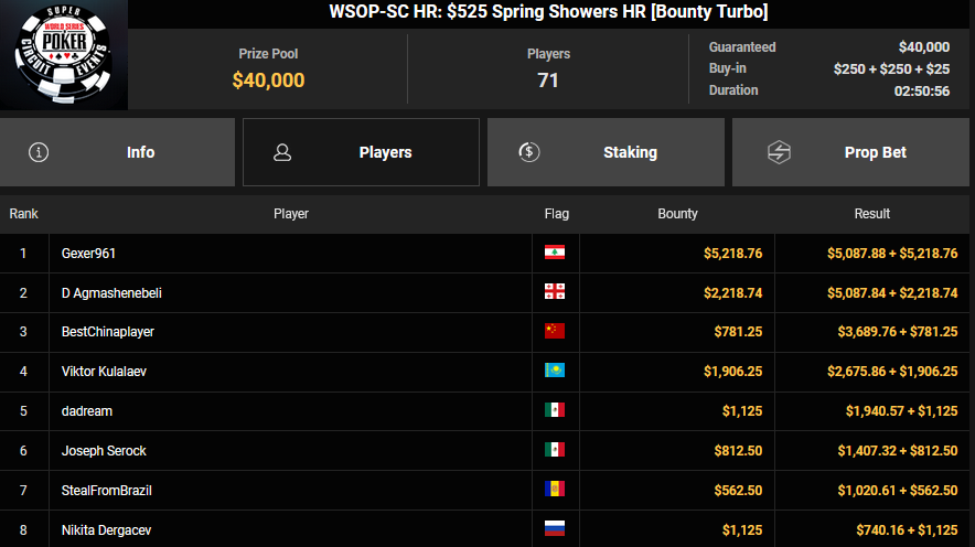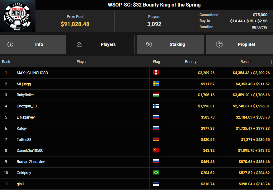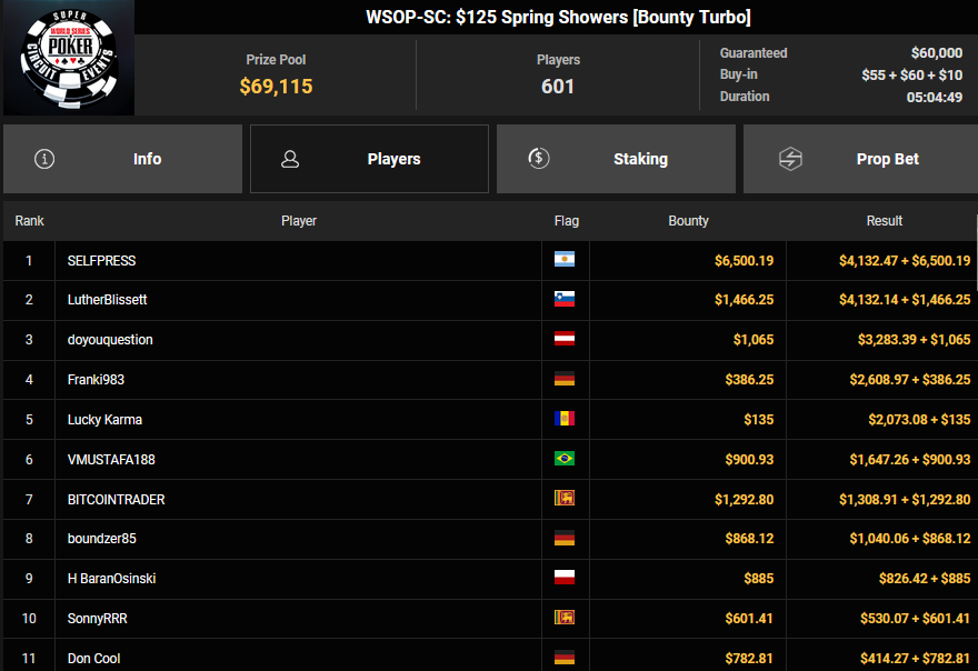 Simon Beckmann konnte sich beim $3.150 Bounty King of the Sprng SHR bei nur zwölf Runners den Sieg für $13.639 + $9.375 sichern. Sasinho wurde Runner-up beim $1.050 PLO Bounty für $5.374 + $2.156. doyouquestion belegte beim $125 Spring Showers Rang 3 für $3.283 + $1.065, Franki983 wurde Vierter für $2.608 + $386. Peja01 wurde beim $50 Super Saver Runner-up für $5.368.