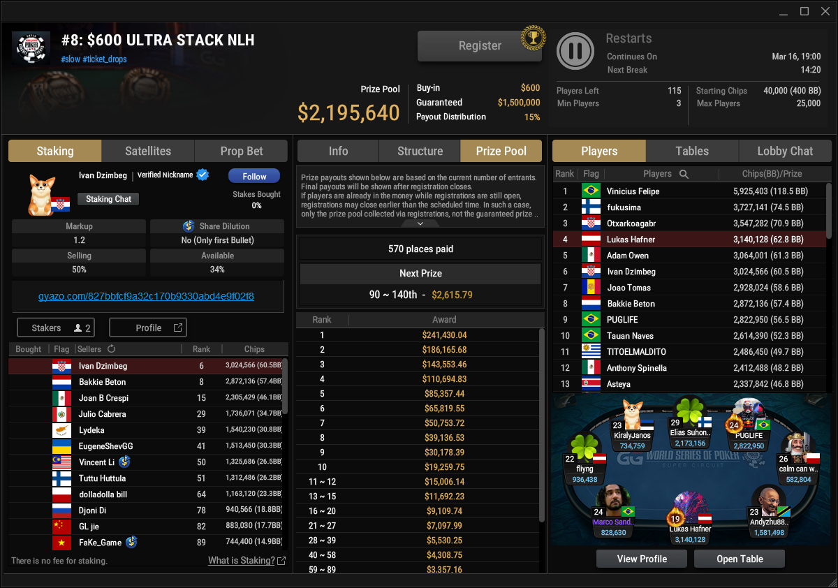 Mit 3.852 Entries kam man auch beim $600 Ultra Stack deutlich über de $1.500.000 Garantie, $2.195.640 waren im Pot. Noch sind es auch 115 Spieler, die heute den Ring und $241.430 Siegprämie jagen. Lukas Hafner ist einer der wenigen deutschsprachigen Spieler, er liegt auf Rang 4.