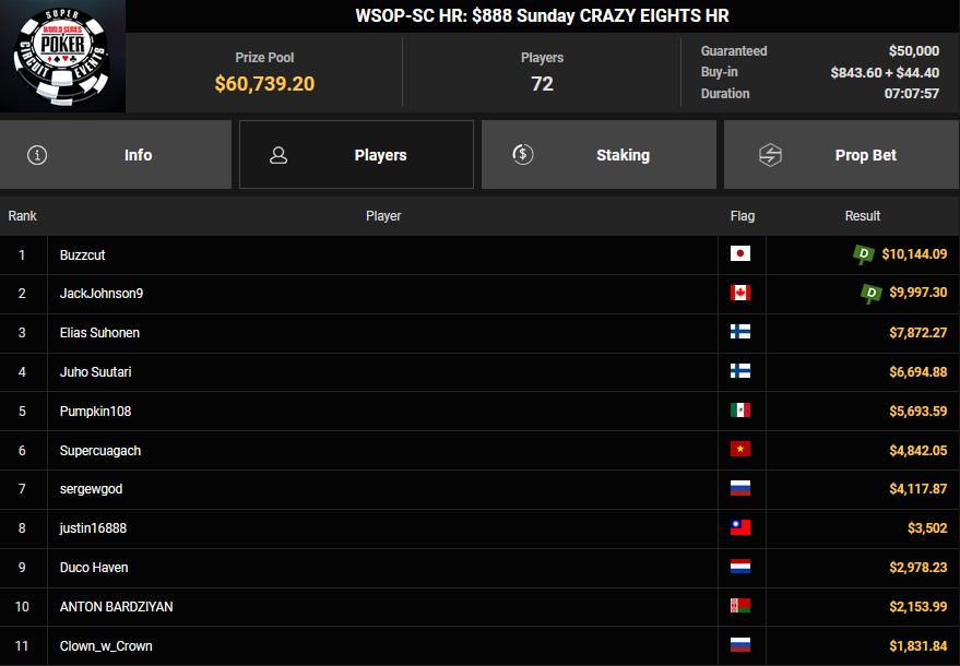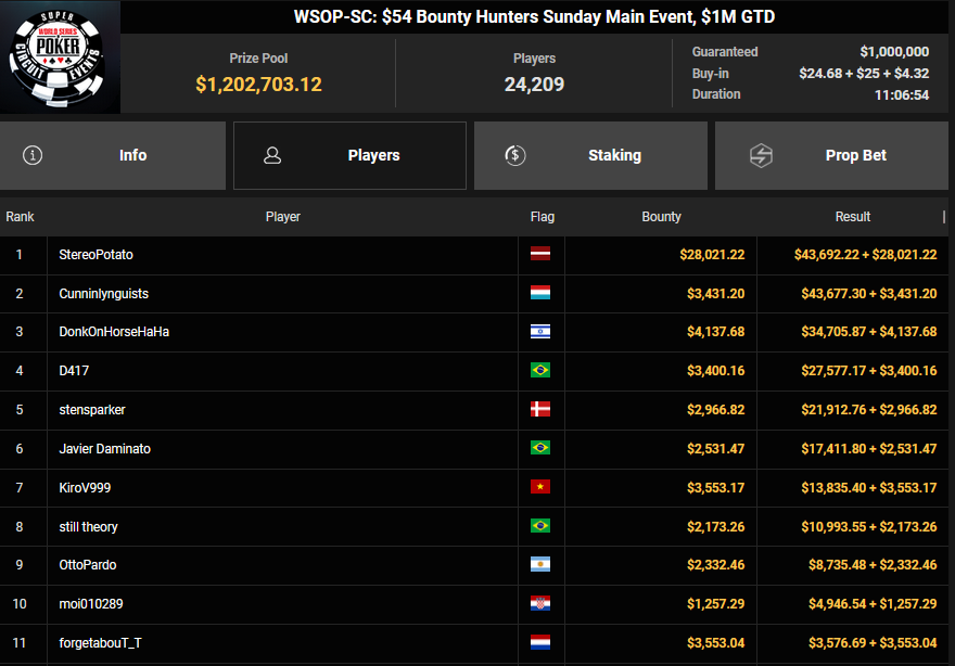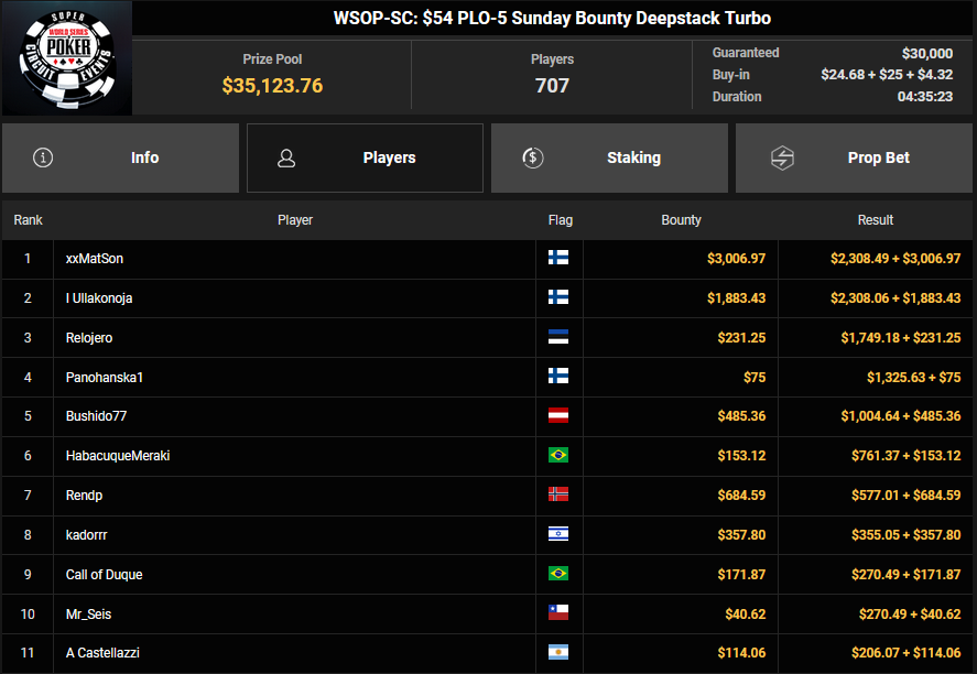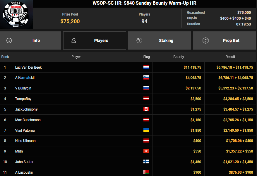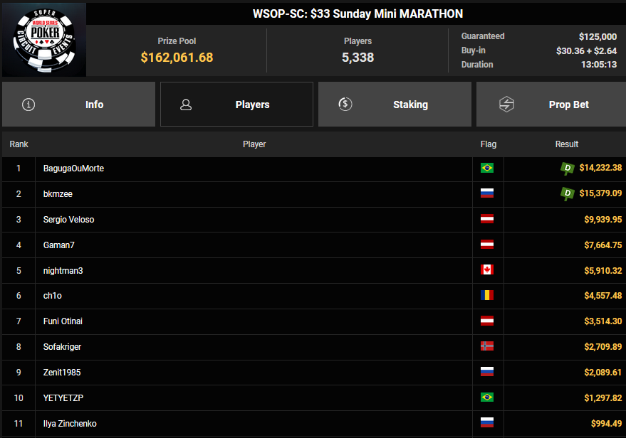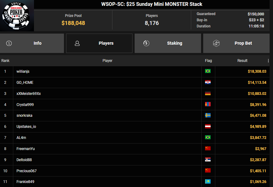 Pascal Hartmann wurde Runner-up beim $250 Monster Stack für $21.572, PauRun kassierte für Rang 3 noch $16.634. xXMeister69Xx belegte beim $25 Mini Monster Stack Rang 3 für $10.883, Steve-Ohhh! wurde beim $300 Sunday Marathon auch Dritter für $7.265.