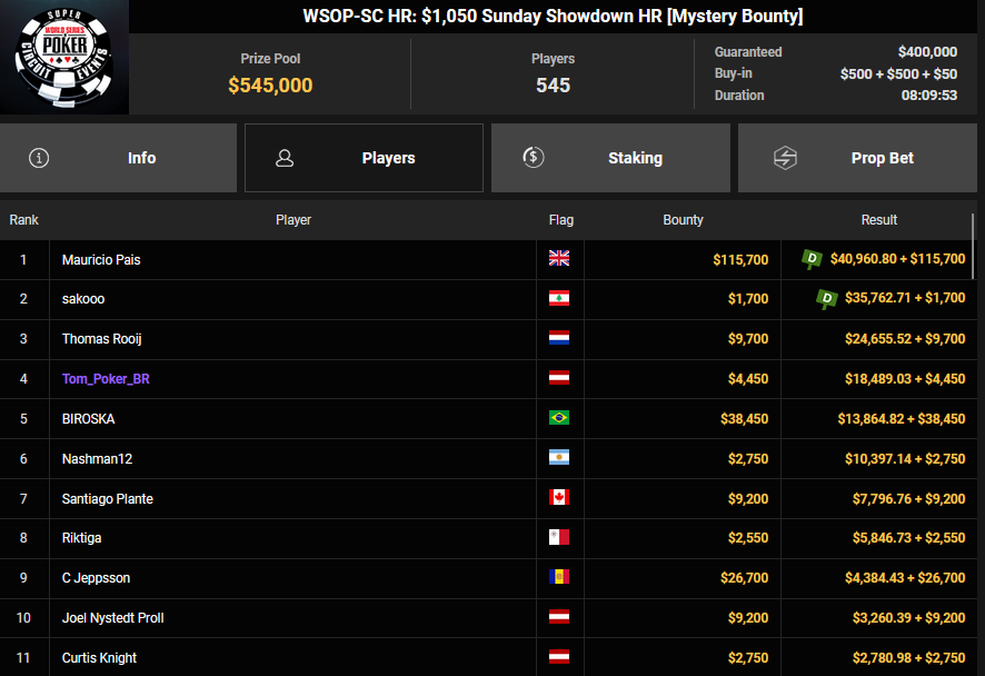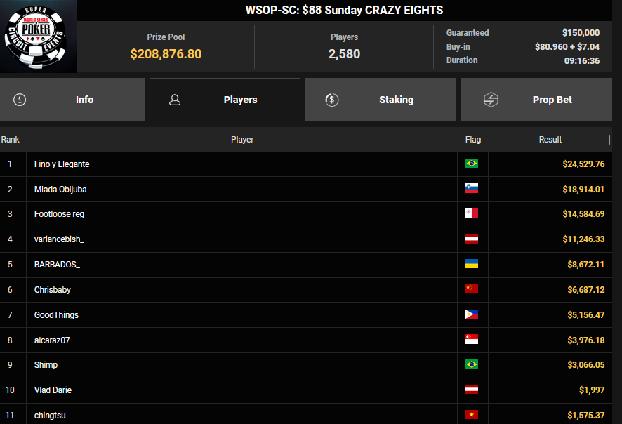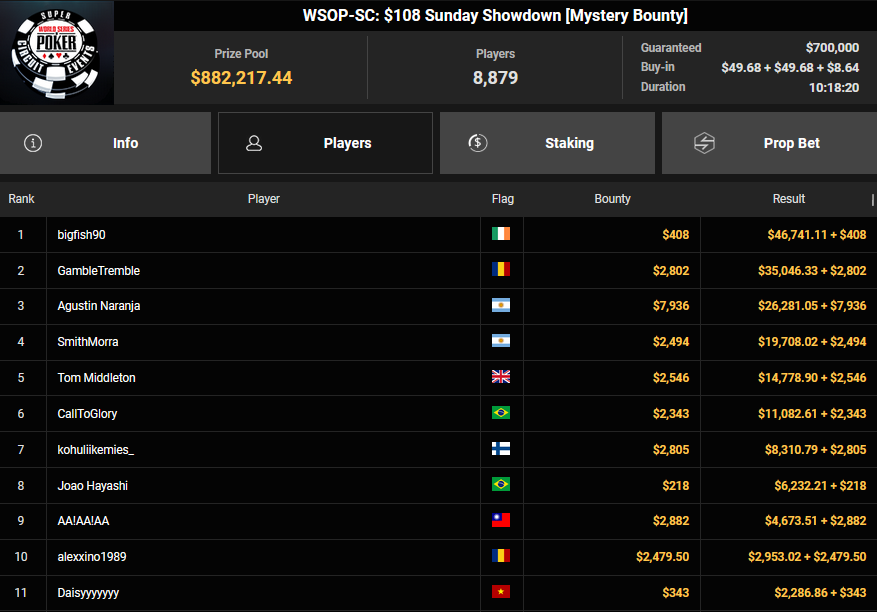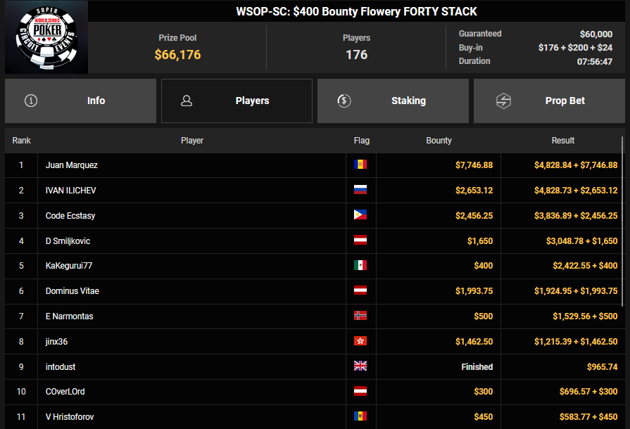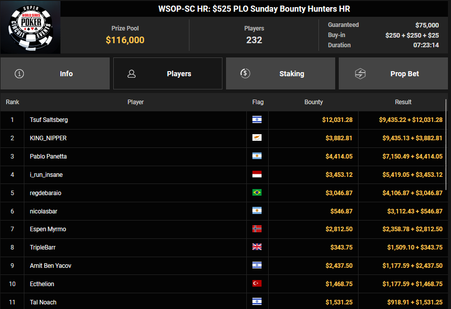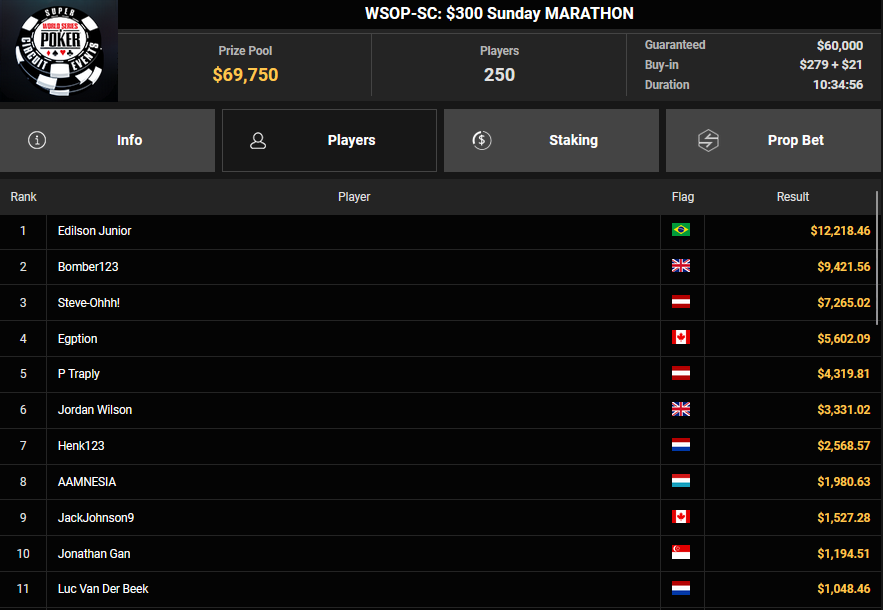 Pascal Hartmann wurde Runner-up beim $250 Monster Stack für $21.572, PauRun kassierte für Rang 3 noch $16.634. xXMeister69Xx belegte beim $25 Mini Monster Stack Rang 3 für $10.883, Steve-Ohhh! wurde beim $300 Sunday Marathon auch Dritter für $7.265.