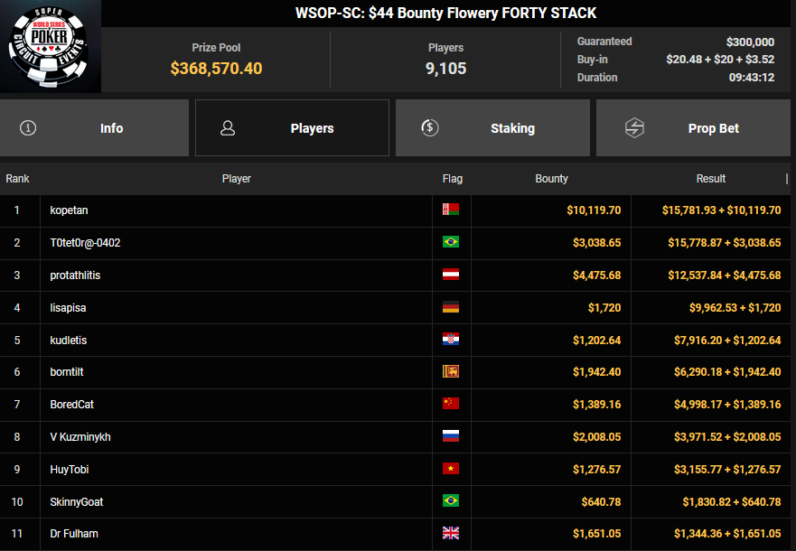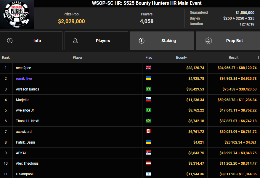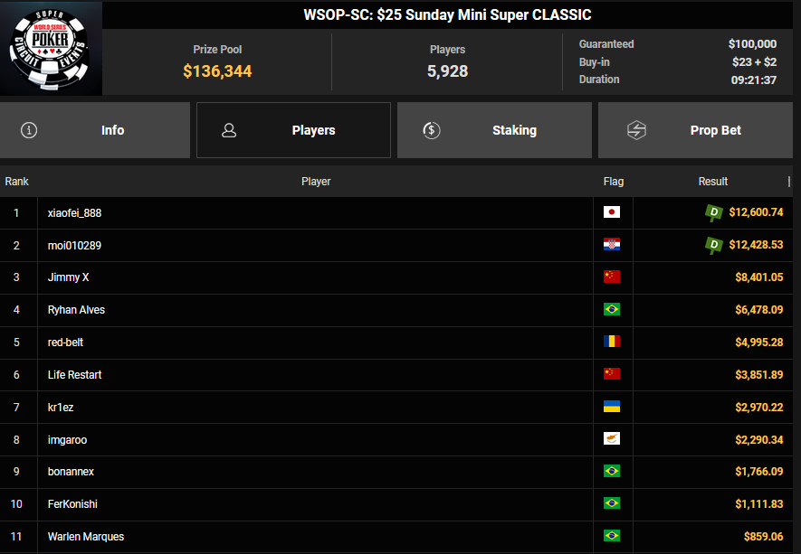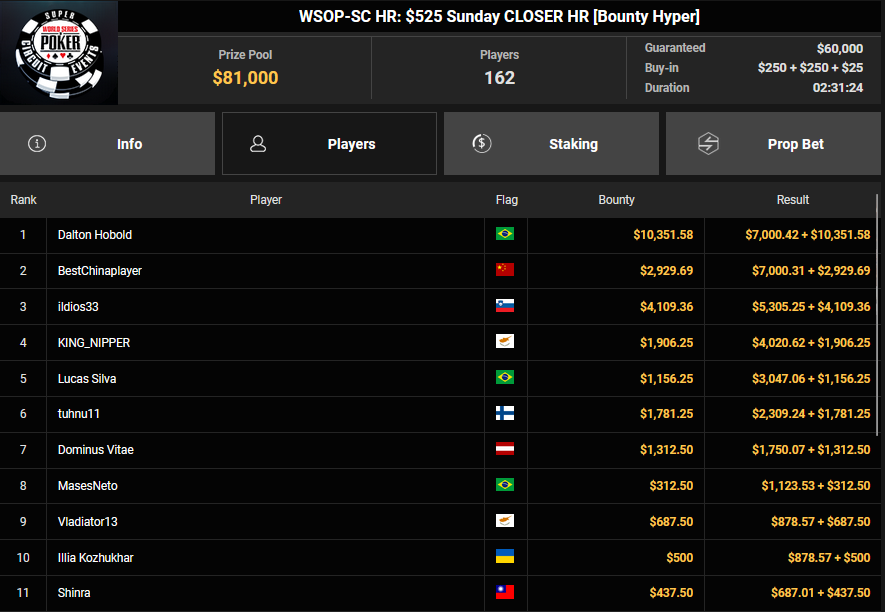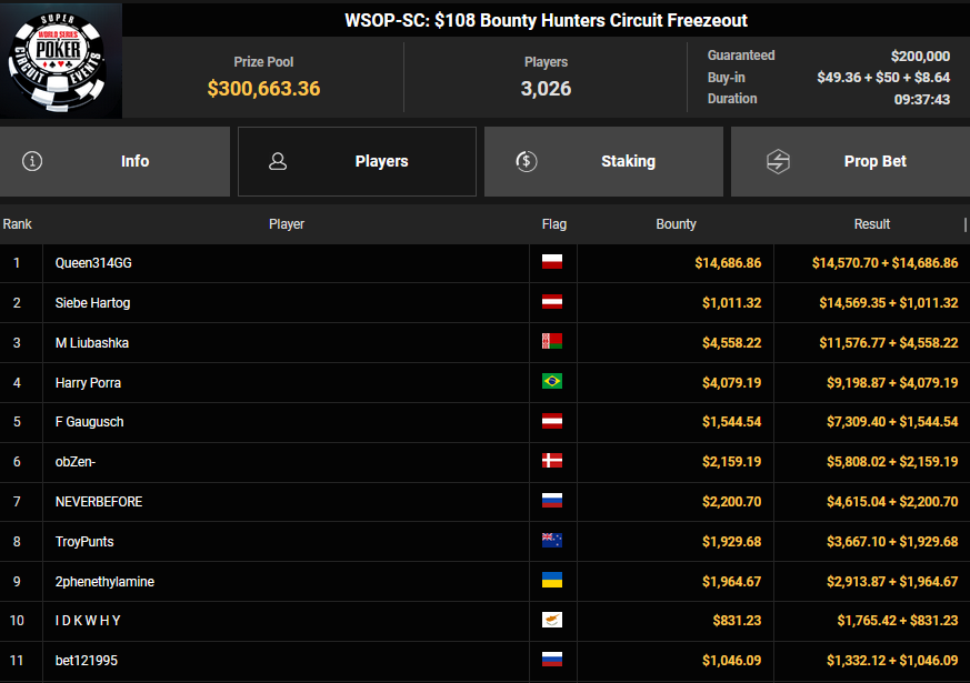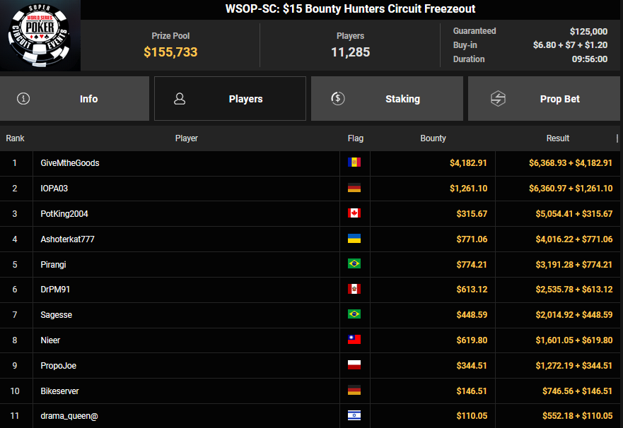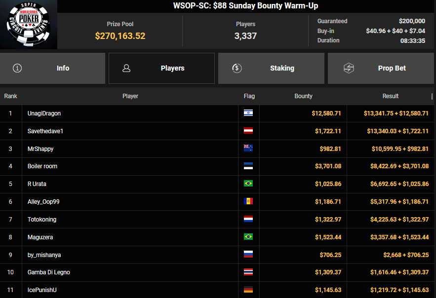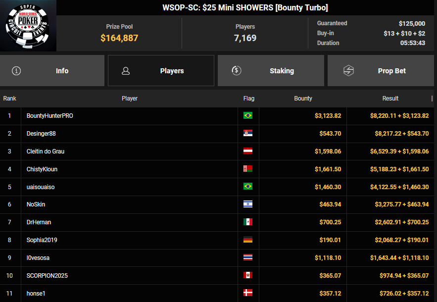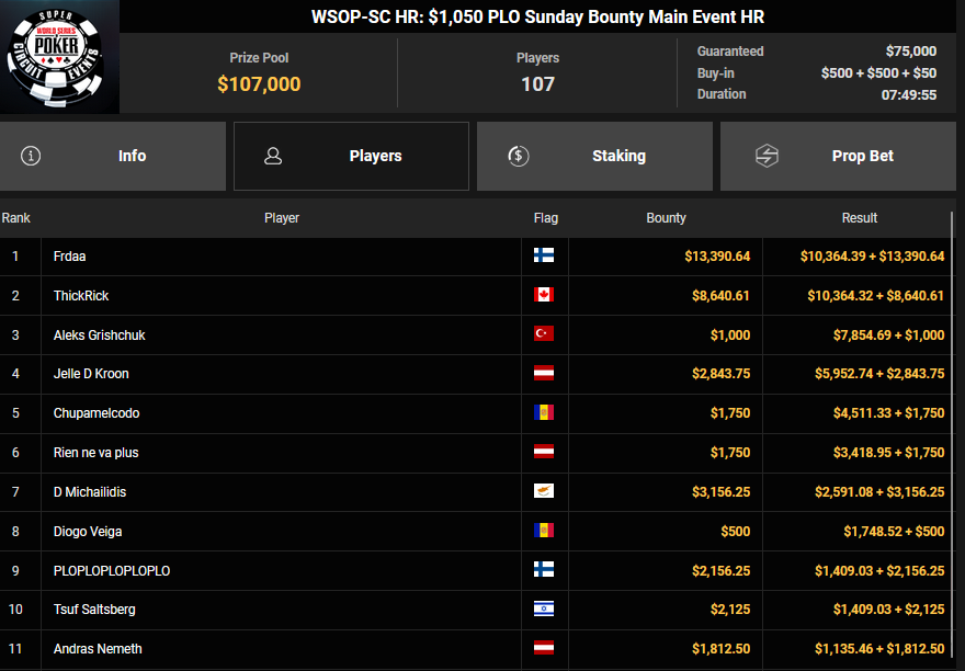Gaman7 machte beim $33 Mini Marathon aus seinem Einsatz $7.664 für Rang 4, Savethedave1 wurde Runner-up beim $88 Sunday Bounty Warm-up für $13.340 + $1.722. irolule kassierte für Rang 3 beim $125 Grand Prix Rang 3 für $29.360, r3s1l13nc3 wurde Vierter für $9.364 beim $25 Mini Grand Prix. protathlitis kassierte für Rang 3 beim $44 Bounty Flowery Forty Stack $12.537 + $4.475, lisapisa nahm für Rang 4 noch $9.962 + $1.720 mit.