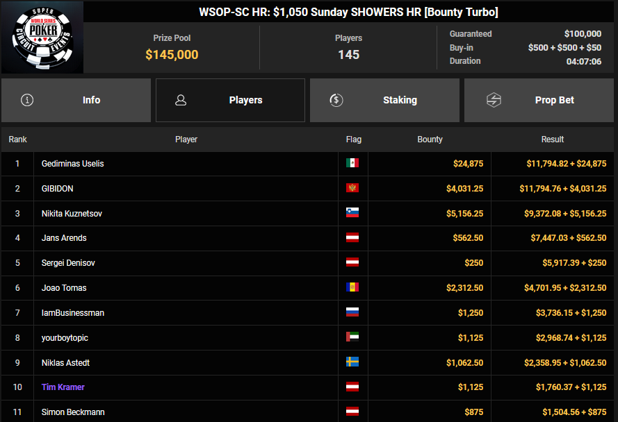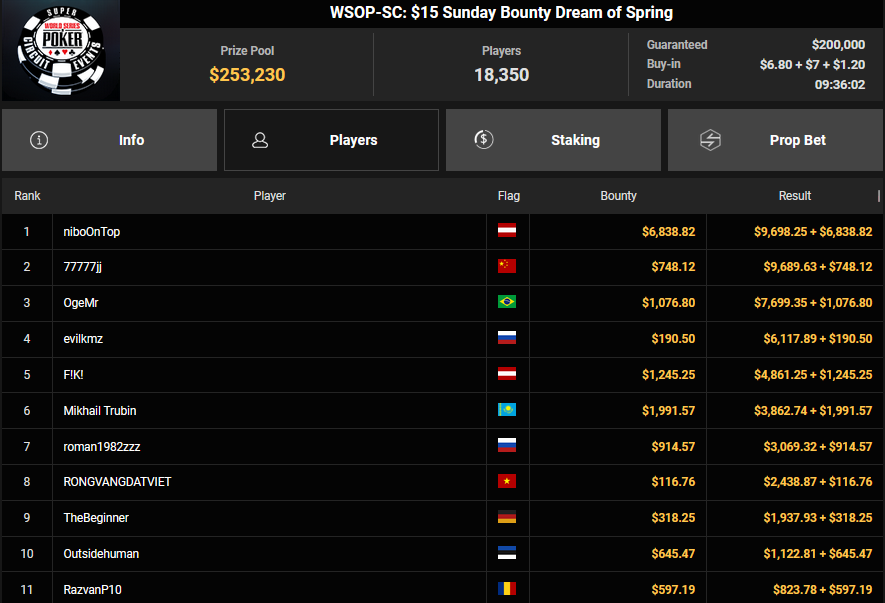 Florian Gaugusch konnte beim $108 Bounty Hunters Circuit Freezeout Rang 5 für $7.309 + $1.544 mitnehmen, baldor999 sicherte sich beim $1.500 Sunday Super Classic den Sieg für $66.015. Mr_3rdBullet setzte sich beim $250 Sunday Super Classic für $32.309 durch. niboOnTop schnappte sich den Sieg beim $15 Sunday Bounty Dream of Spring und kassierte $9.698 + $6.838.