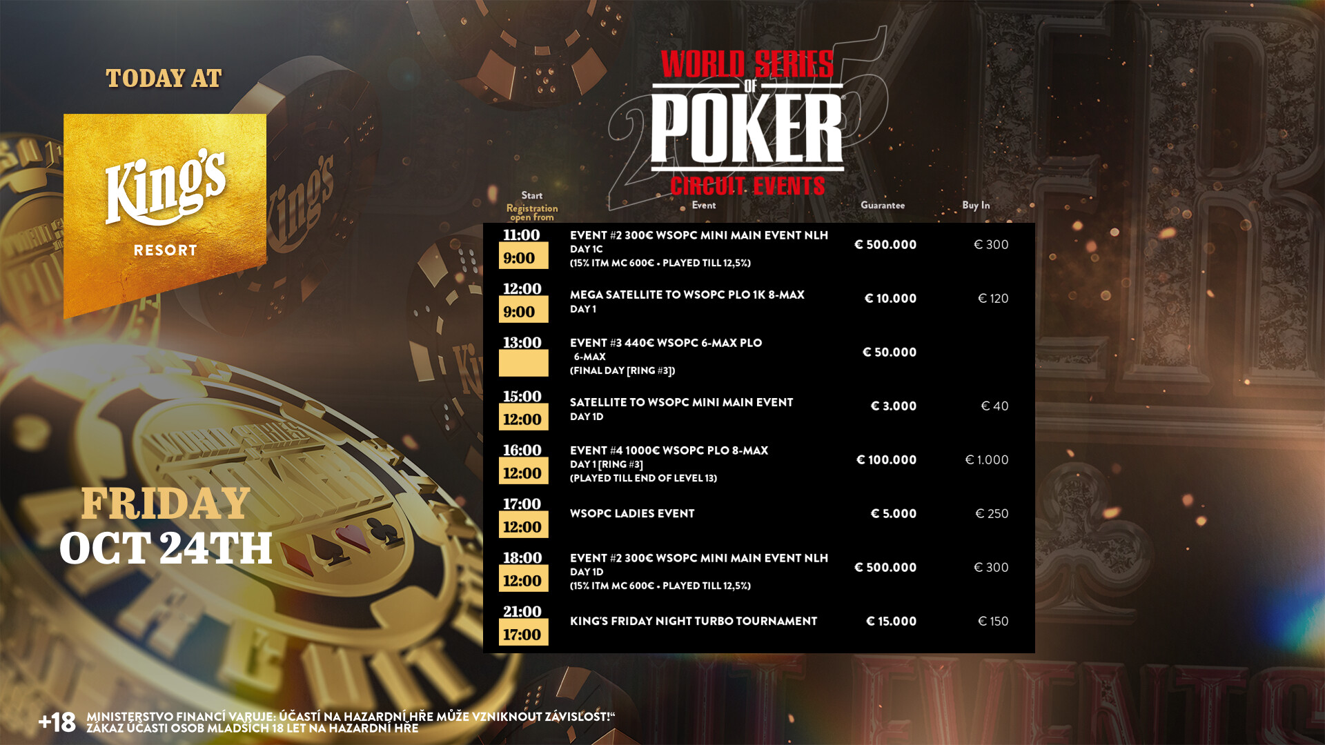 Heute geht es um 11 Uhr und um 18 Uhr an die Tische, außerdem kann auch im King’s Prag gestartet werden. Außerdem wird das € 1.000 PLO (€ 100.000 GTD/50k/40′) eröffnet, als Side Events warten das € 250 WSOPC Ladies (€ 5.000 GTD/20k/20′) und das € 150 King’s Friday Night Turbo (€ 15.000 GTD/15k/15′). Die Cash Games starten wie gewohnt ab den Blinds € 1/2 NLH bzw. € 2/2 PLO wird gespielt. Alle Infos zum kompletten Angebot findet Ihr unter kings-resort.com.