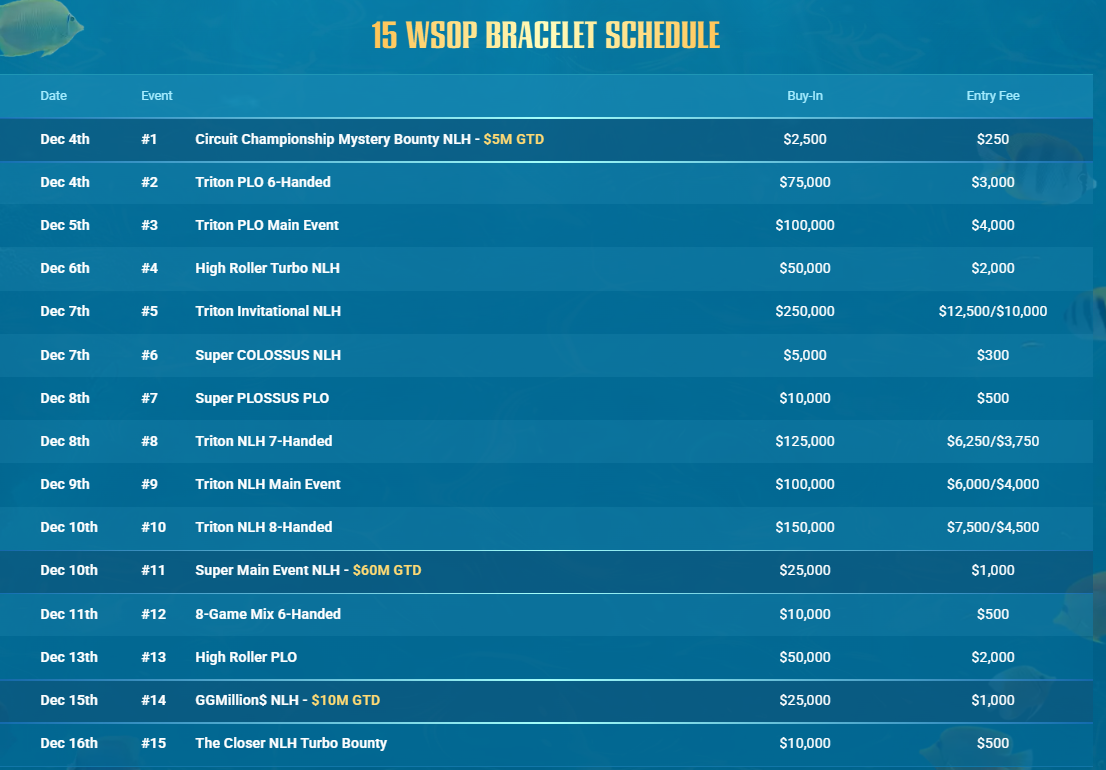 Die WSOP Paradise wird dieses Jahr zum dritten Mal ausgetragen und lässt es mit dem $60.000.000 GTD Super Main Event so richtig krachen. Das Buy-In beträgt dabei allerdings auch $25k. Auch die anderen 14 Bracelet Events im Atlantis Resort haben ein doch schon respektables Buy-in – nicht zuletzt weil es auch eine Partnerschaft mit Triton gibt. Das günstigste Event der WSOPP ist die $2.500 WSOP Circuit Championship ($5.000.000 GTD), für das die WSOP Circuit Ring Gewinner ein $5.000 Package erhalten. Das teuerste Event in der Karibik ist das $250.000 Triton Invitational.